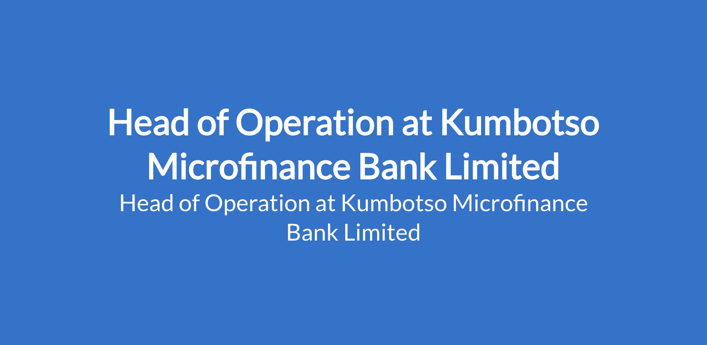 Kumbotso Microfinance Bank Limited is recruiting to fill the position of: Head of Operation. The position is located in Kano State. Interested candidates should possess a BSc Degree or its equivalent in Banking & Finance, Accounting or any other Management Science discipline with a minimum of 5 years experience Banking in related industry in which (3) three-years must be in managerial positions.