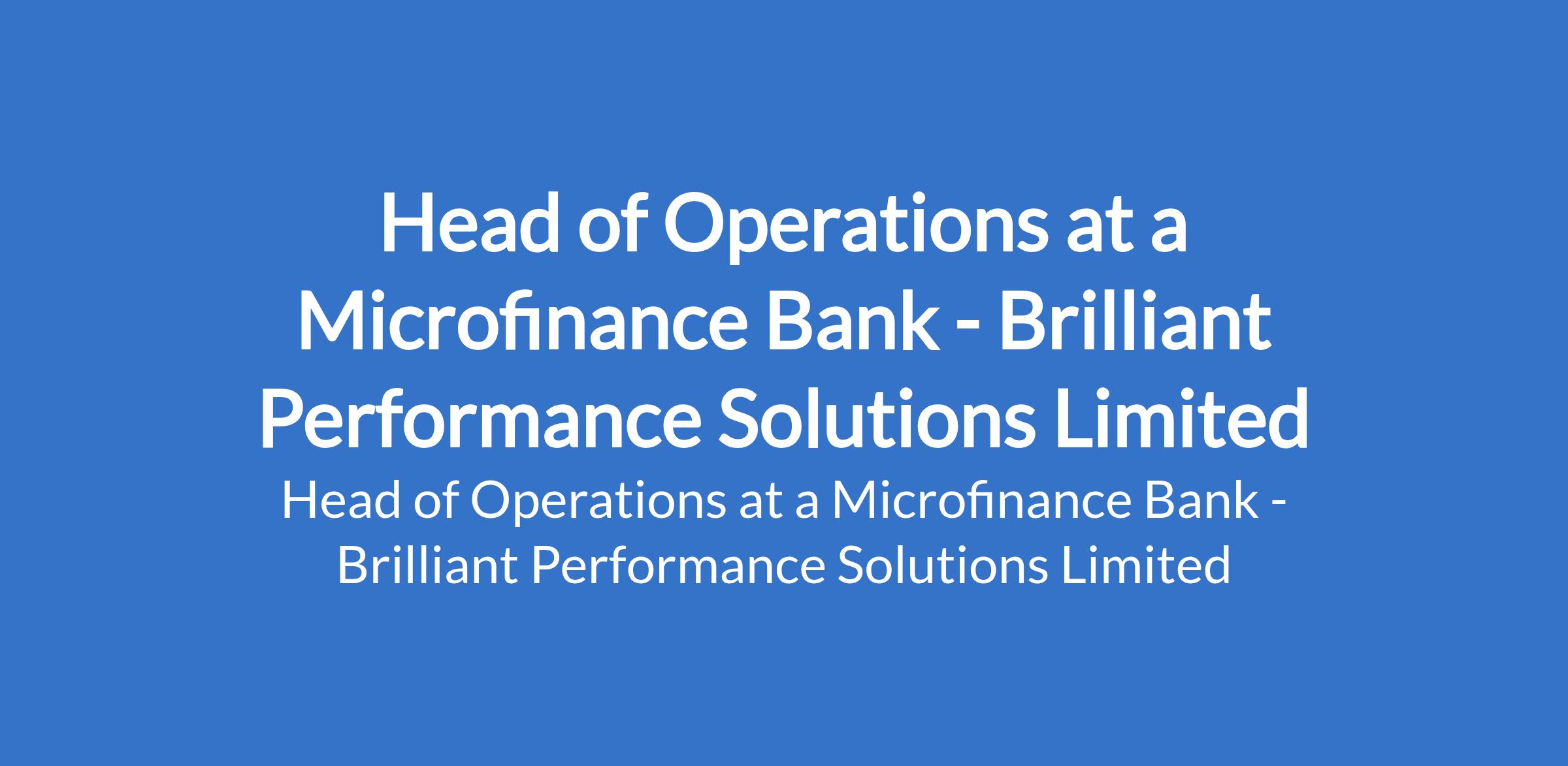 Brilliant Performance Solutions Limited - Our client, a Microfinance Bank is recruiting to fill the position of: Head of Operations. The position is located in Ipaja, Lagos State. Interested candidate should possess an HND / B.Sc Degree in any relevant field, must have worked or still working with a Microfinance Bank for a period not less than five years, and must be a chartered Microfinance Banker or writing the final stage of obtaining the certificate.