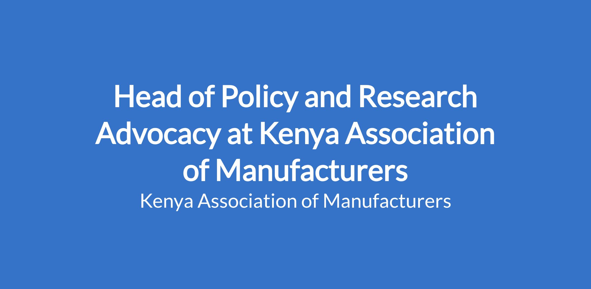 The Kenya Association of Manufacturers (KAM) is seeking to competitively fill the position of Head of Policy and Research Advocacy. The Head of Policy and Research Advocacy will provide strategic leadership in driving industrial policies and fostering a conducive business environment. The role involves conducting research, data collation, analysis, and packaging information into position papers for dissemination and advocacy with relevant stakeholders. The position also requires collaboration with Business Membership Organizations (BMOs) to generate and advocate policy positions externally. The scope of work covers fiscal, legal and regulatory, monetary, environmental, trade, social, and technological policies impacting KAM members.