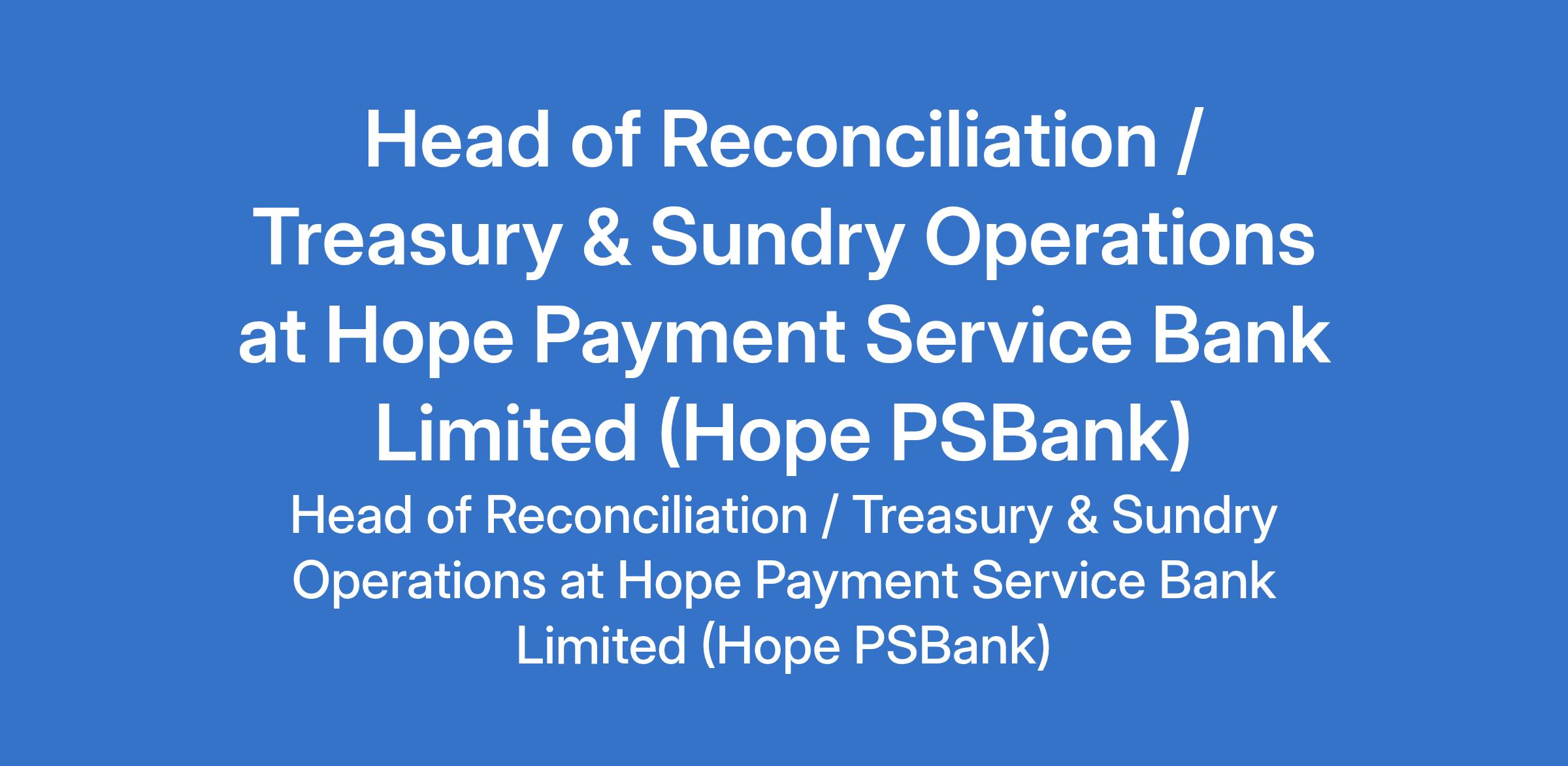 Hope Payment Service Bank Limited (Hope PSBank) is recruiting to fill the position of: Head of Reconciliation / Treasury & Sundry Operations. The position is located in Lagos State. Interested candidates should possess a minimum of First Degree or its equivalent in Accounting, Banking and Finance or related discipline with a minimum of 10 years post-graduation experience in Banking Operations.