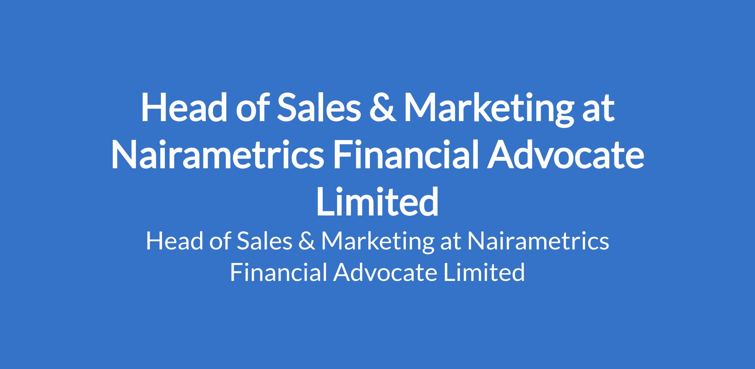 Nairametrics Financial Advocate Limited is recruiting to fill the position of: Head of Sales & Marketing. The position is located in Lekki Phase 1, Lagos State. Interested candidates should possess relevant qualifications with 7 10 years experience in sales, marketing, or commercial roles.