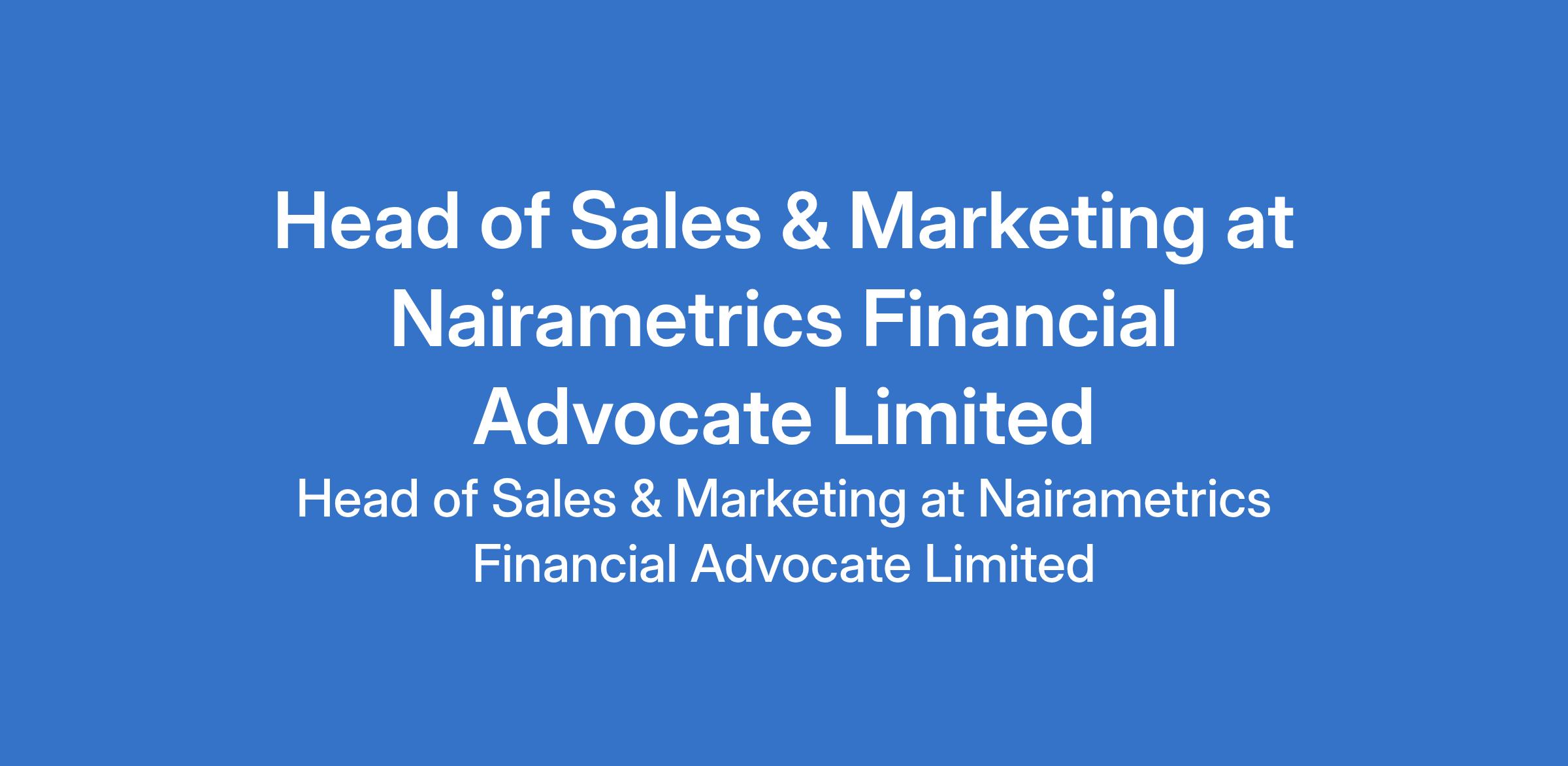 Nairametrics Financial Advocate Limited is recruiting to fill the position of: Head of Sales & Marketing. The position is located in Lekki Phase 1, Lagos State. Interested candidates should possess a Bachelors Degree in Marketing, Business, Communications, or a related field with a minimum of 5 years experience in marketing, growth, or commercial roles, with a proven track record in lead generation and revenue growth.
