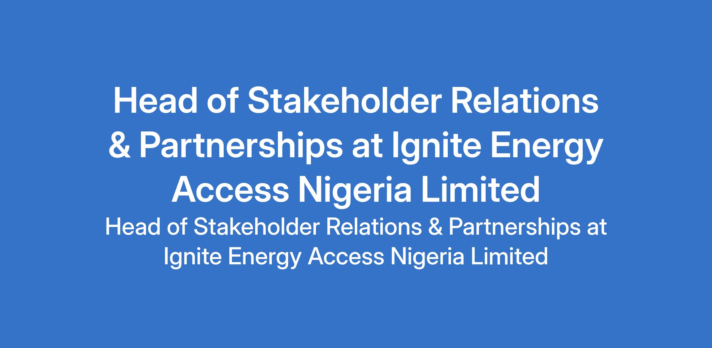 Ignite Energy Access Nigeria Limited is recruiting to fill the position of: Head of Stakeholder Relations & Partnerships. The position is located in Lagos State. Interested candidates should possess a minimum of University Degree, preferably in Development Management, Social Policy / Political Science / Public Administration / Economics with a minimum of 7 years management experience and at least three (3) of which should be in a senior management position.