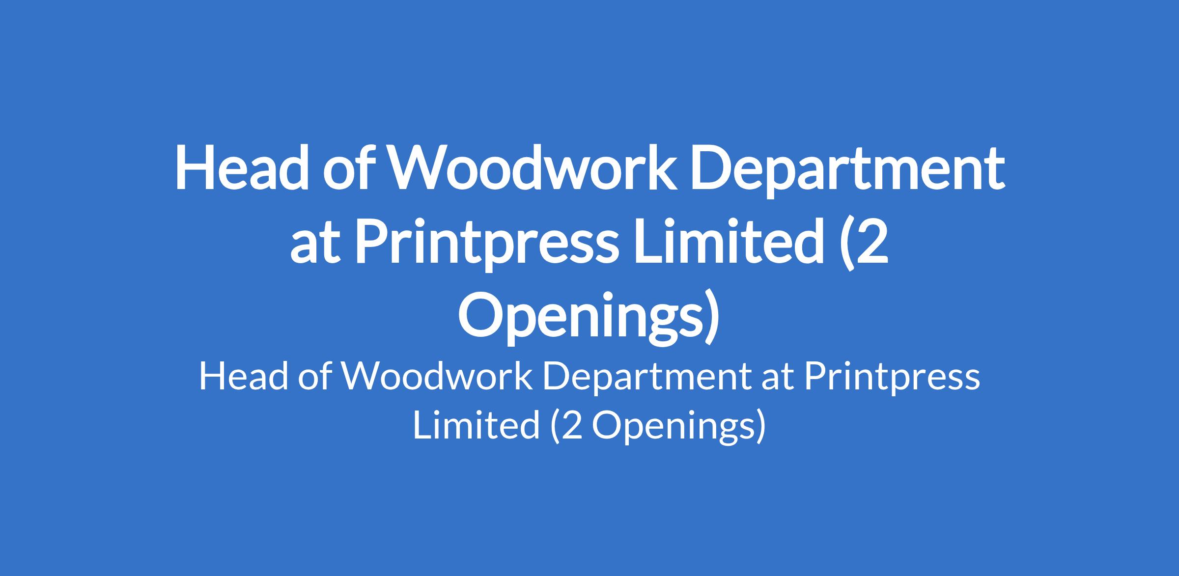Printpress Limited is recruiting to fill the position of: Head of Woodwork Department. The position is located in Ibeju Lekki, Lagos and Rivers States. Salary: N120,000 - N150,000 monthly. The ideal candidate should be versatile, detail-oriented, and capable of managing a small team within the department. Interested candidates should possess a minimum of an SSCE qualification; higher qualifications are an advantage, with 35 years of experience in woodworking or carpentry; technical certification or vocational training in carpentry/woodwork is preferred.