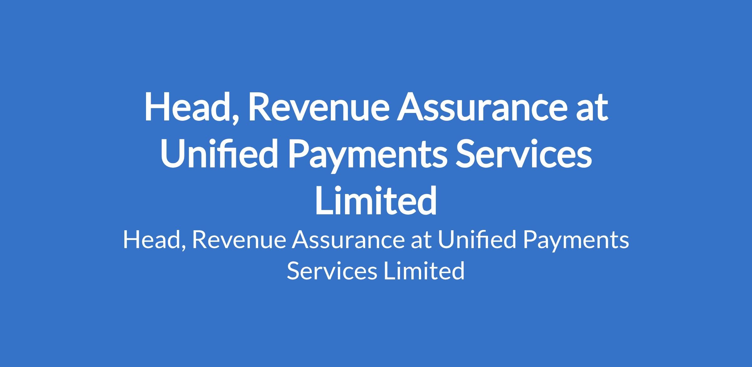 Unified Payments Services Limited is recruiting to fill the position of: Head, Revenue Assurance. The position is located in Lagos State. Interested candidates should possess a Bachelors Degree in Accounting, Finance, Economics, or a related field with a minimum of 10 years relevant experience, with at least 5 years in audit leadership roles focused on revenue assurance, risk management, or financial controls.