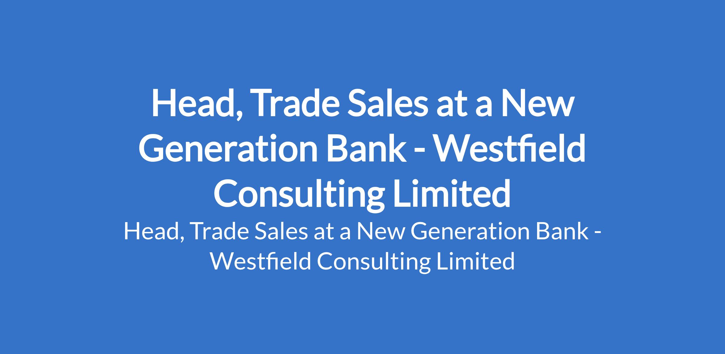 Westfield Consulting Limited - Our client in the Banking sector (One of the new generation banks) is recruiting to fill the position of: Head, Trade Sales. The position is located in Lagos State. Interested candidates should possess a First Degree in Finance, Business, Economics, or a related field with 10 years experience in trade finance, with at least 4 years in a sales leadership role.