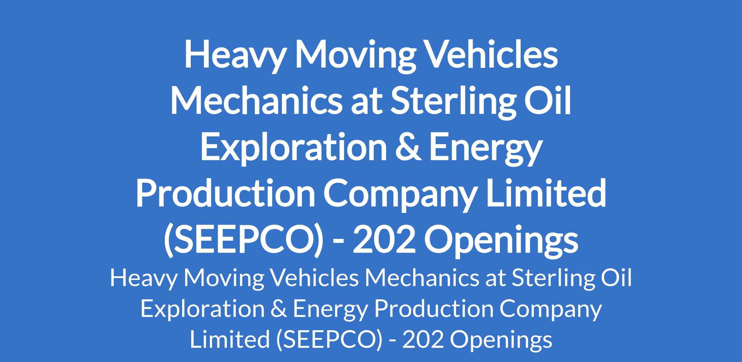 Sterling Oil Exploration & Energy Production Company Limited (SEEPCO) is recruiting to fill the position of: Heavy Moving Vehicles Mechanic. The position is located in Ikot Abasi - Akwa Ibom and Elele - Rivers States. Interested candidates should possess a minimum of SSCE; Trade Test I, II & III certifications with a minimum of 10 years hands-on experience in a similar role.