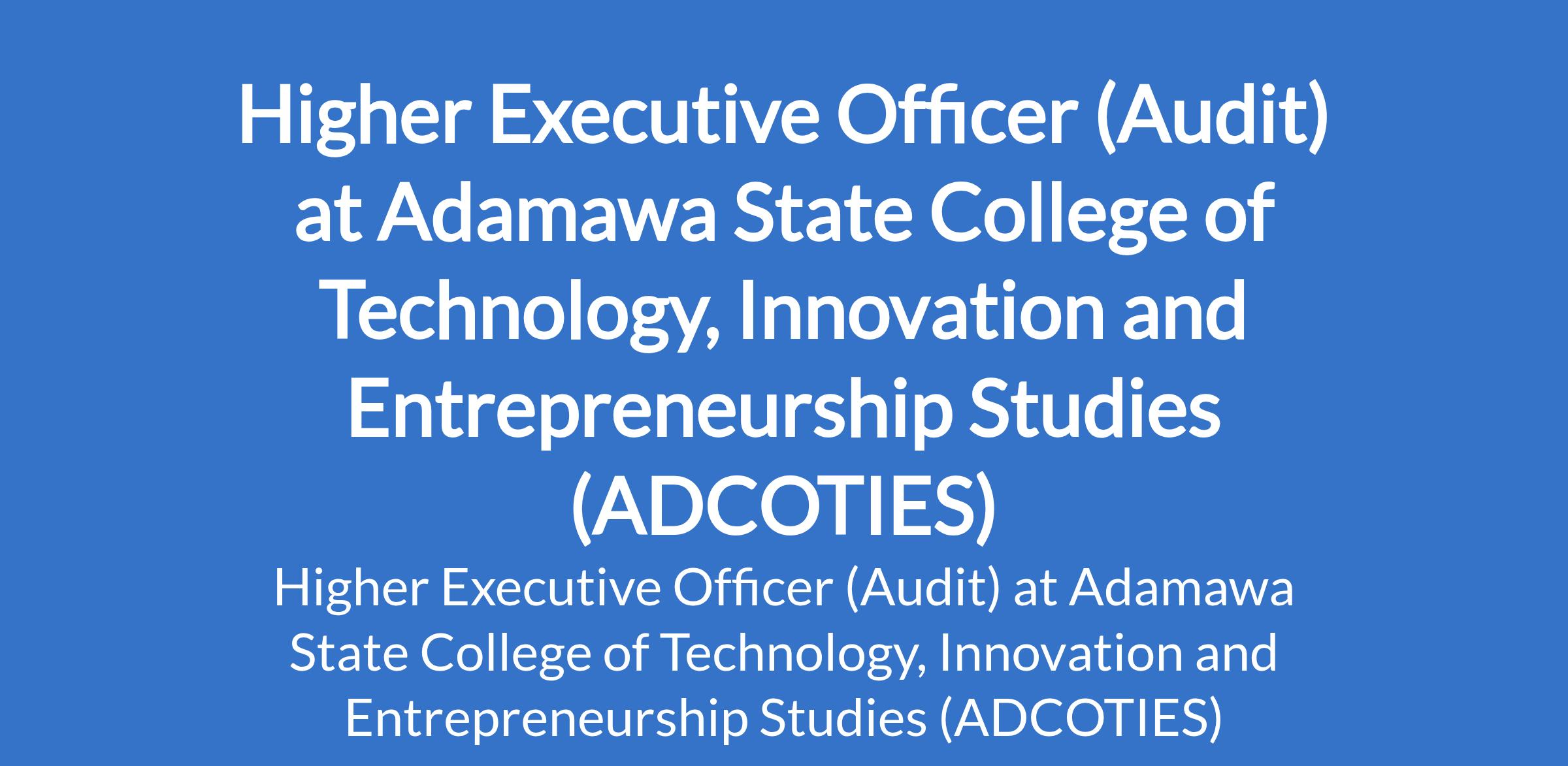 Adamawa State College of Technology, Innovation and Entrepreneurship Studies (ADCOTIES) is recruiting to fill the position of: Higher Executive Officer (Audit). The position is located in Gulak, Adamawa State. Interested candidates should possess an HND in Accounting relevant discipline with Minimum of Credit from a recognised Institution.