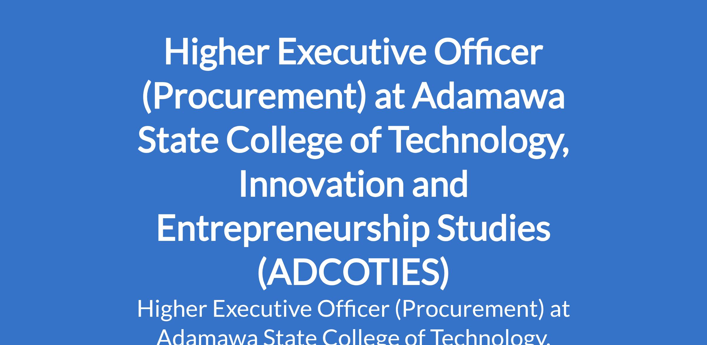 Adamawa State College of Technology, Innovation and Entrepreneurship Studies (ADCOTIES) is recruiting to fill the position of: Higher Executive Officer (Procurement). The position is located in Gulak, Adamawa State. Interested candidates should possess an HND or equivalent in relevance discipline with Minimum of Credit from a recognized institution with experience.