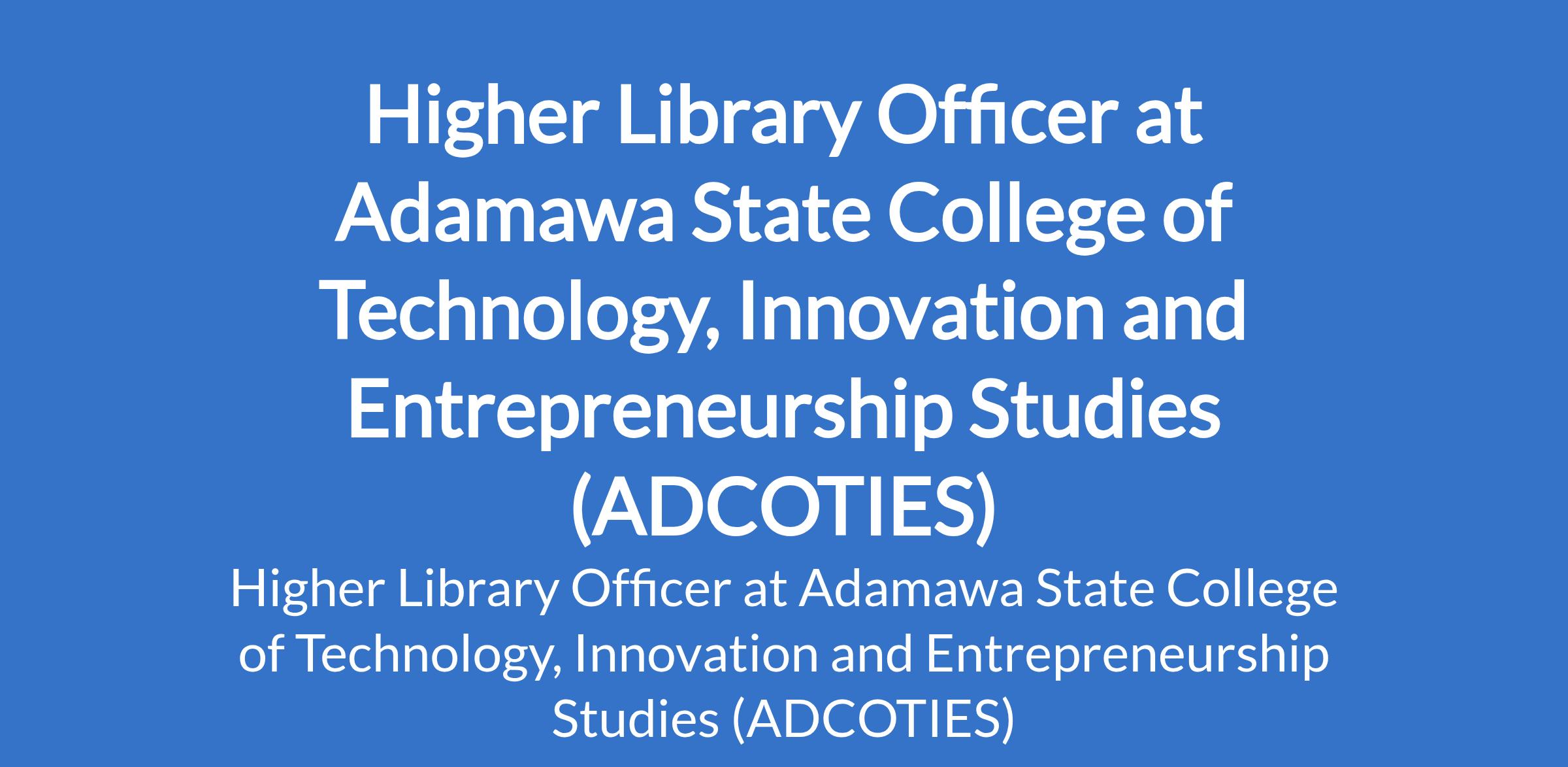 Adamawa State College of Technology, Innovation and Entrepreneurship Studies (ADCOTIES) is recruiting to fill the position of: Higher Library Officer. The position is located in Gulak, Adamawa State. Interested candidates should possess an HND with minimum of Credit Level in nevant from a recognited institution discipline plus NYSC discharge or exemption certificate
