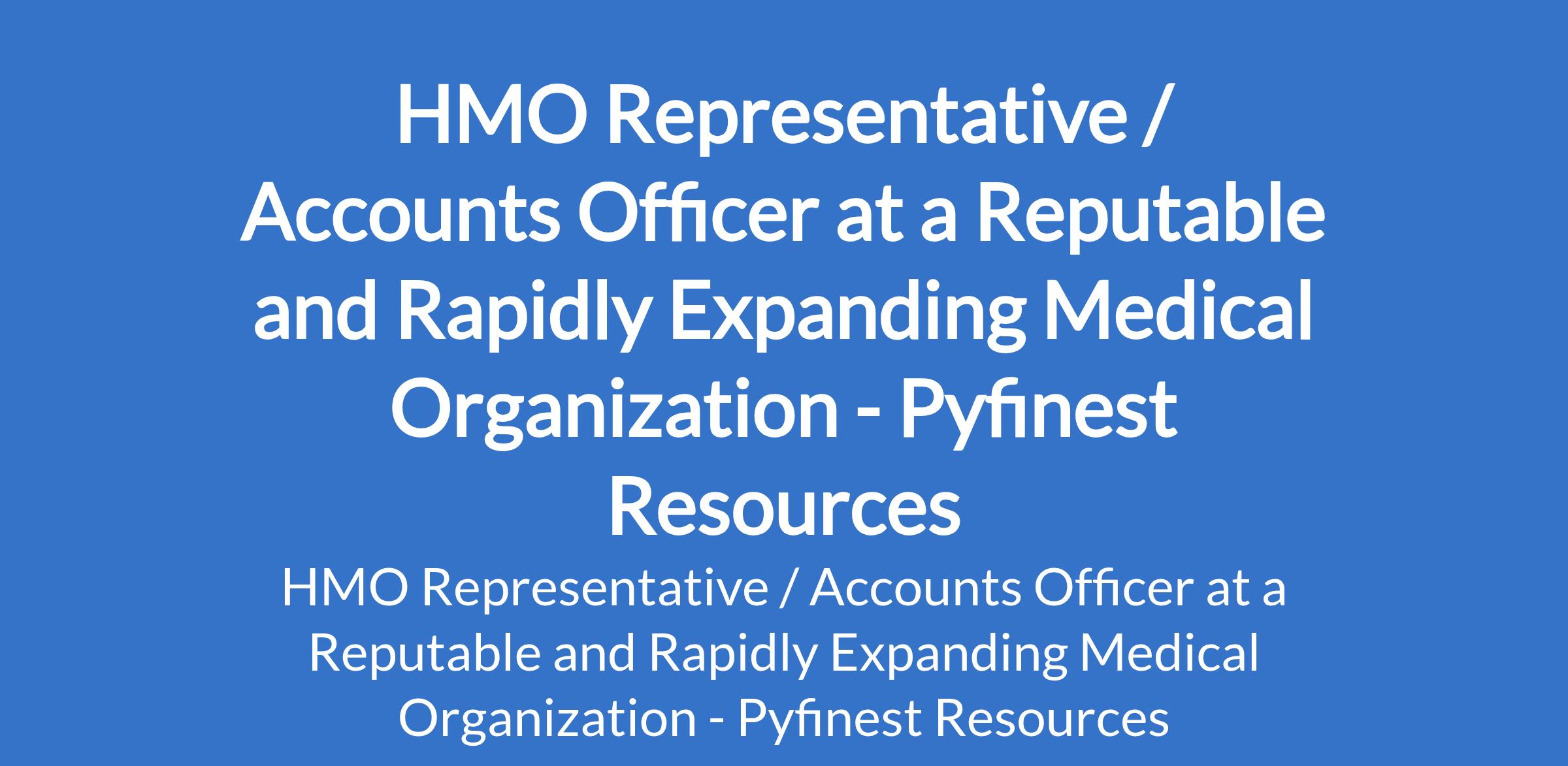 Pyfinest Resources - Our client, a Reputable and Rapidly Expanding Medical organization is recruiting to fill the position of: HMO Representative / Accounts Officer. The position is located in Port Harcourt, Rivers State. Salary: N120,000 / month. Interested candidates should possess a Bachelors Degree in Accounting or Business Administration with 1 2 years experience in a healthcare, hospital, or HMO-related role.