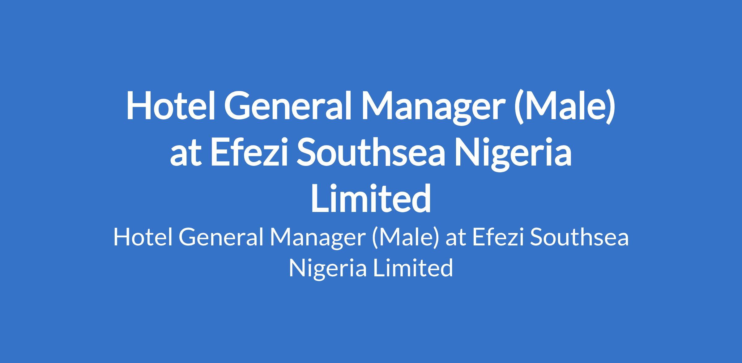 Efezi Southsea Nigeria Limited is recruiting to fill the position of: Hotel General Manager (Male). The position is located in Gwarinpa, Abuja (FCT). Salary: N350,000 - N400,000 / month. Interested candidates should possess relevant qualification with experience.