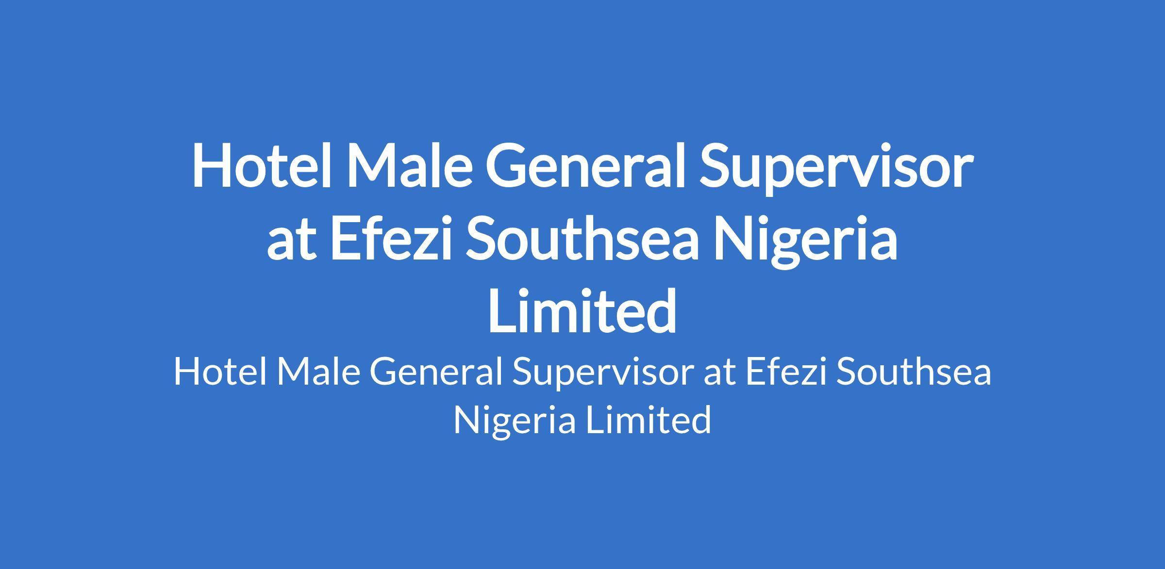 Efezi Southsea Nigeria Limited is recruiting to fill the position of: Hotel Male General Supervisor. The position is located in Abule-Egba, Lagos State. Salary: N100,000 / month. Interested candidates should possess a Diploma or Degree in Hospitality Management (often preferred)Experience in hotel operations (usually 25+ years)
