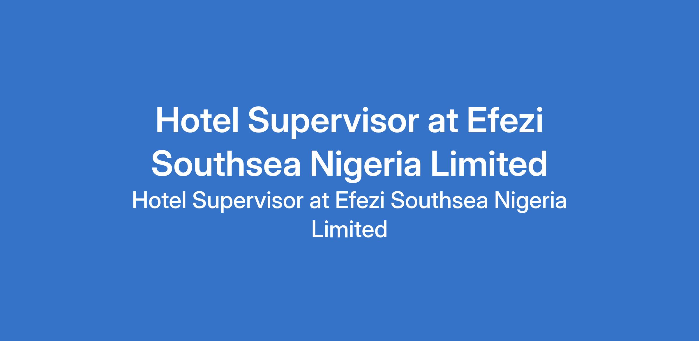 Efezi Southsea Nigeria Limited is recruiting to fill the position of: Hotel Supervisor. The position is located in Apapa, Lagos State. Salary: N100,000 - N120,000 per month. Interested candidates should possess relevant qualifications and candidates must reside in Wilmer, Apapa, Boundary, Ajegunle, Festac and its environs.