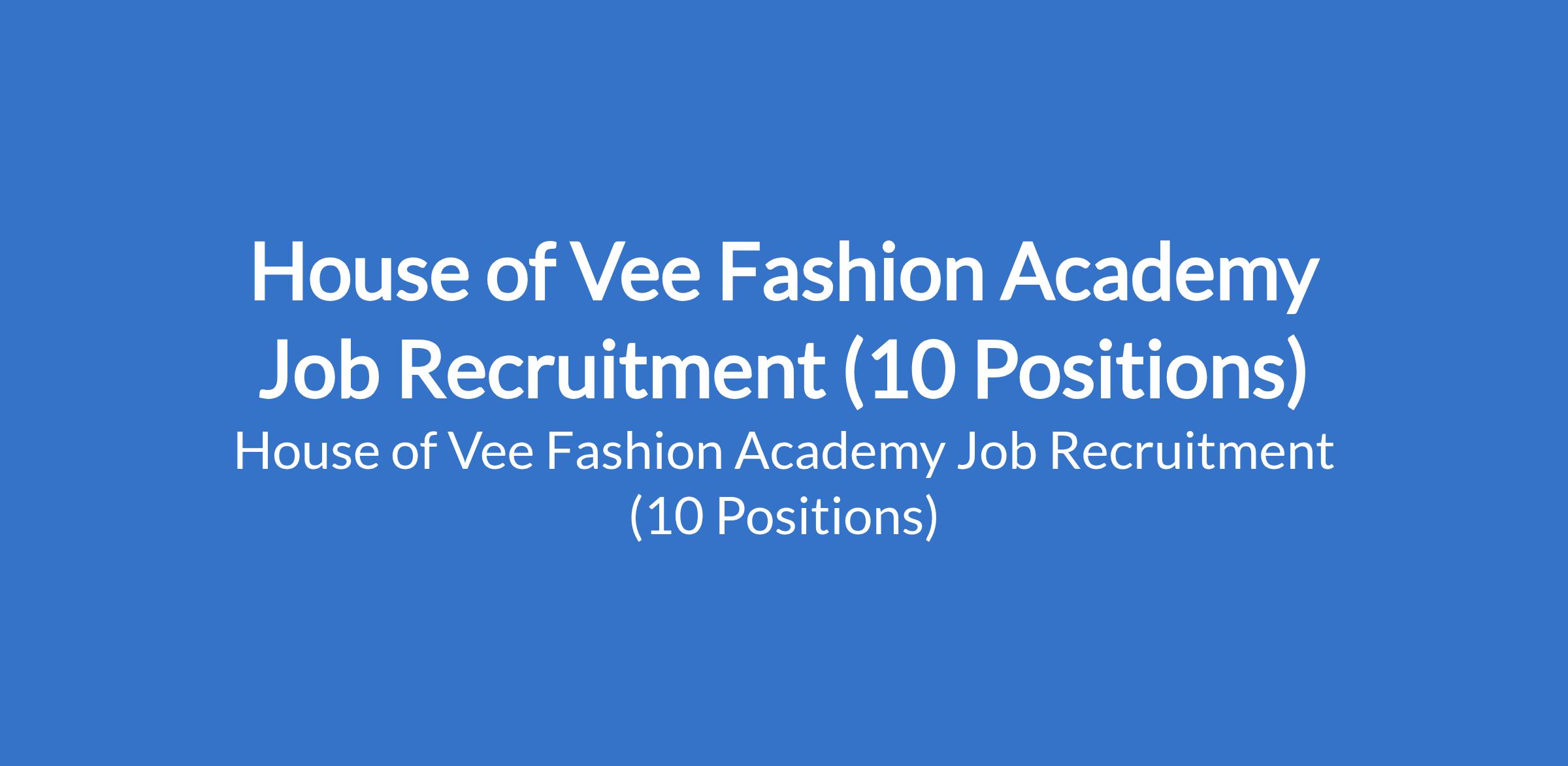 House of Vee Fashion Academy is recruiting suitably qualified candidates to fill the following positions:Technical Instructor (Pattern Drafter / Cutter) Fashion Illustrator, Fashion Business Instructor, Administration OfficerProfessional Tailor, Production Manager, Fashion Designer, Fashion Stylist, Office Assistant, and Cleaning Staff.
