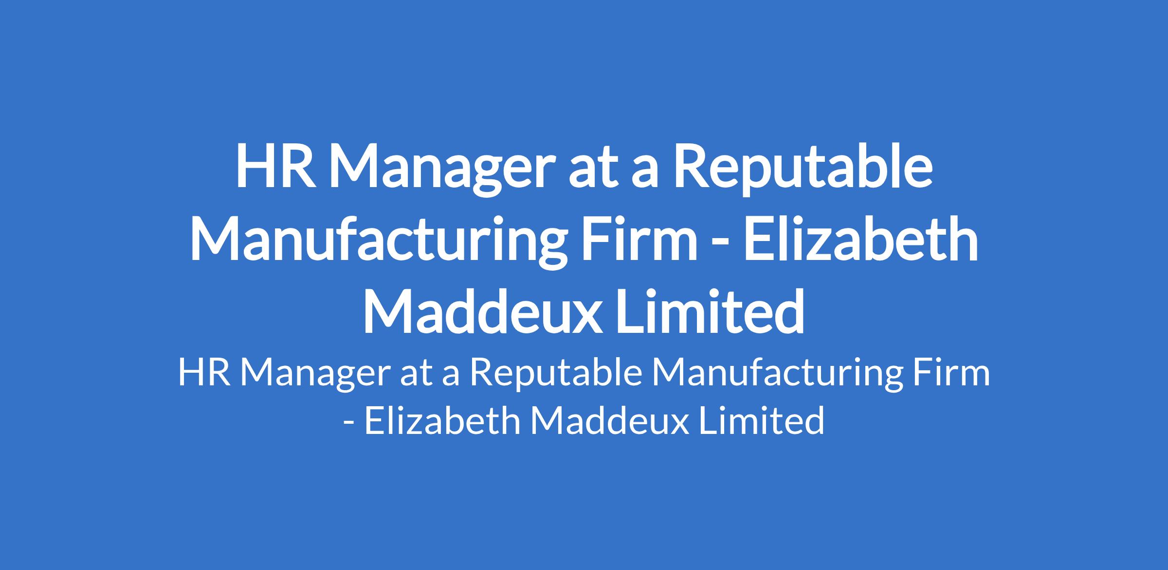Elizabeth Maddeux Limited - Our client, a reputable manufacturing firm is recruiting to fill the position of: HR Manager. The position is located in Enugu State. Interested candidates should possess a B.Sc. Degree in Industrial & Labour Relations, Human Resource Management, Personnel Management, or any related Management discipline with a minimum of 10 years of progressive HR experience.
