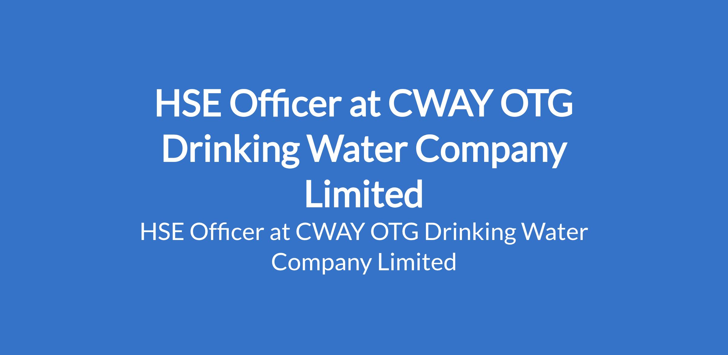 CWAY OTG Drinking Water Company Limited is recruiting to fill the position of: HSE Officer. The position is located in Sagamu, Ogun State. Salary: N100,000 - N170,000 / month. Interested candidates should possess a Bachelor's Degree in Occupational Health and Safety, Environmental Science, Engineering, or related field with 3 years of proven experience in health, safety, and environmental management, with a focus on industrial, construction, or manufacturing environments.