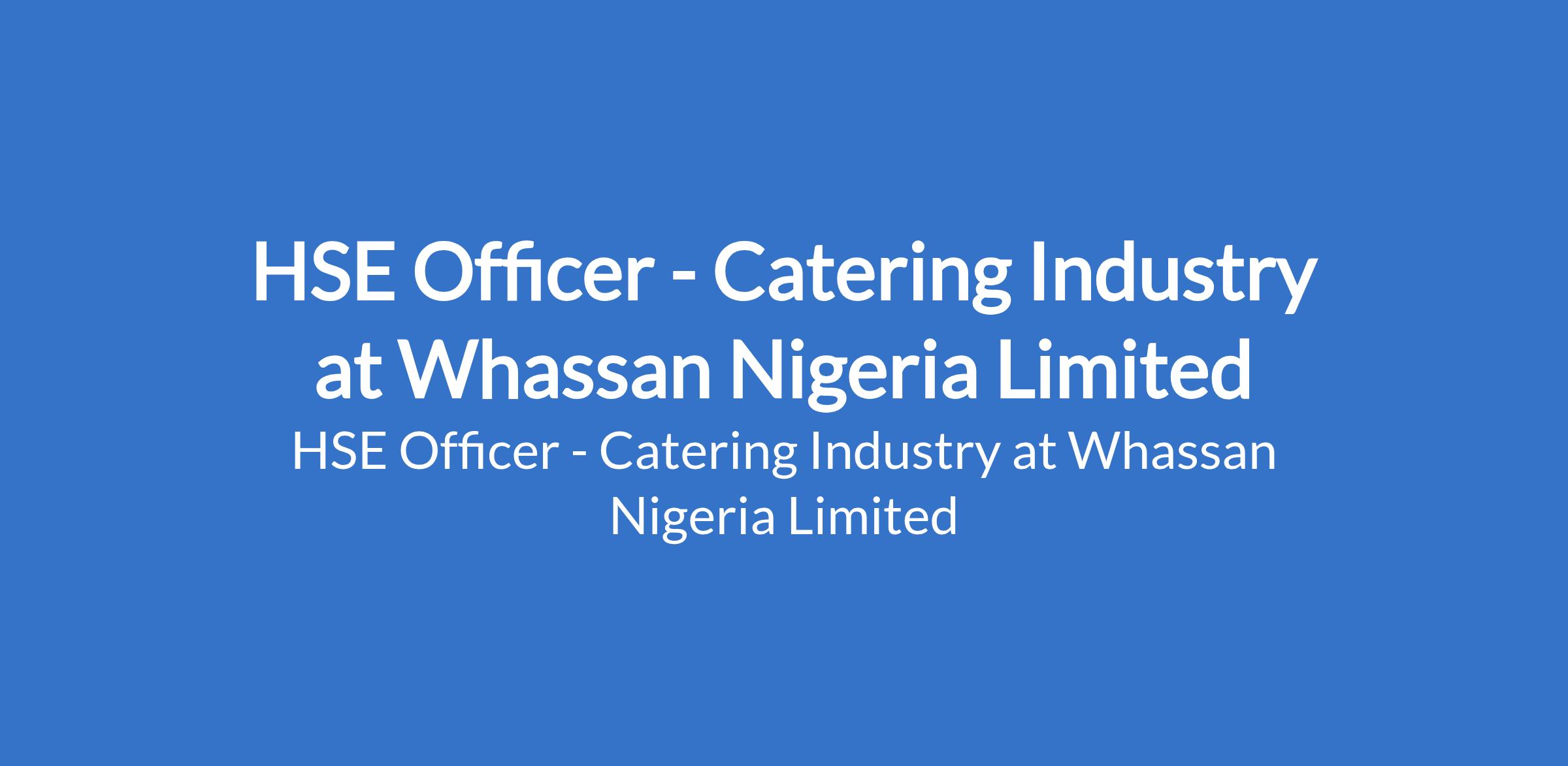 Whassan Nigeria Limited is recruiting to fill the position of: HSE Officer - Catering Industry. The position is located in Port Harcourt, Rivers State. Salary: N200,000 - N215,000 monthly. Interested candidates should possess relevant qualifications with exprerience in the food industry,