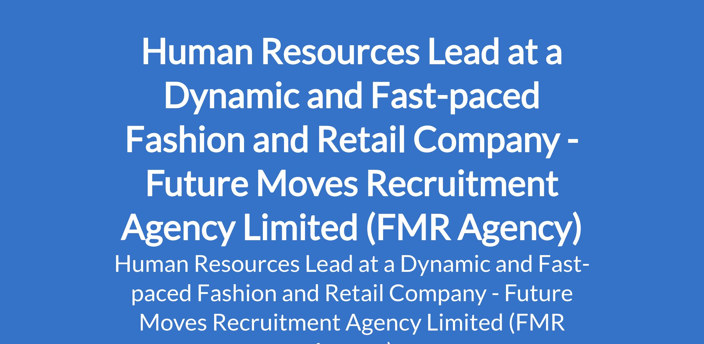 Future Moves Recruitment Agency Limited (FMR Agency) - Our client that operates in a dynamic and fast-paced fashion and retail environment is recruiting to fill the position of: Human Resources Lead. The position is located in Ilupeju, Lagos State. Salary: N400,000 - N500,000 monthly. Interested candidates should possess a Bachelors Degree in Human Resources, Business Administration, Management, or a related field with a minimum of 4 years experience in Human Resources, preferably within retail, fashion, or consumer-facing industries.
