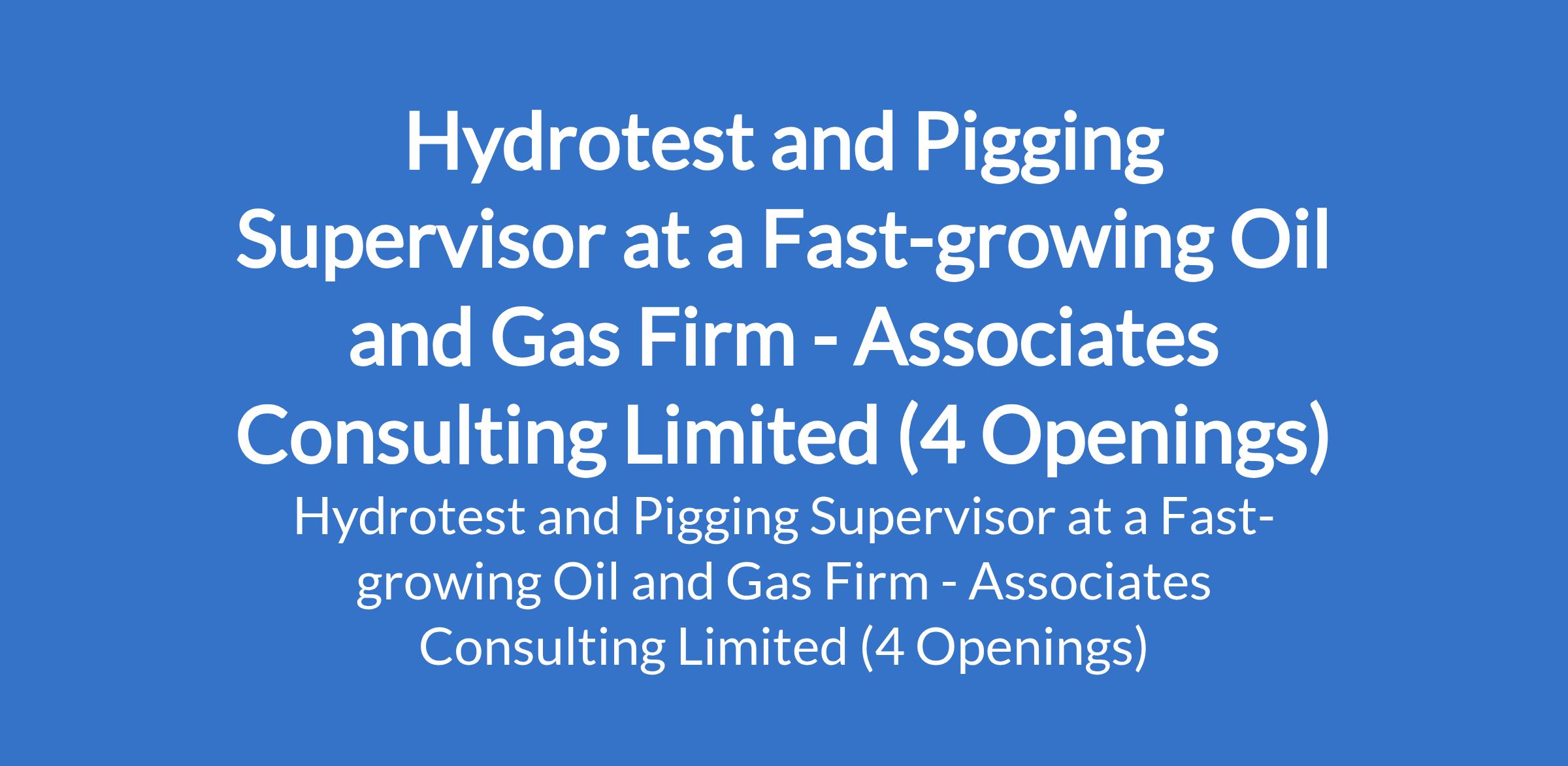 Associates Consulting Limited - Our client, a fast-growing indigenous upstream, mid-stream and downstream oil and gas group, is recruiting to fill the position of: Hydrotest and Pigging Supervisor. The position is located in Akwa Ibom, Delta, Imo, and Rivers States. Interested candidates should possess a Diploma or Degree / HND in any course or Trade Test Certificate with minimum of 7 years relevant experience.