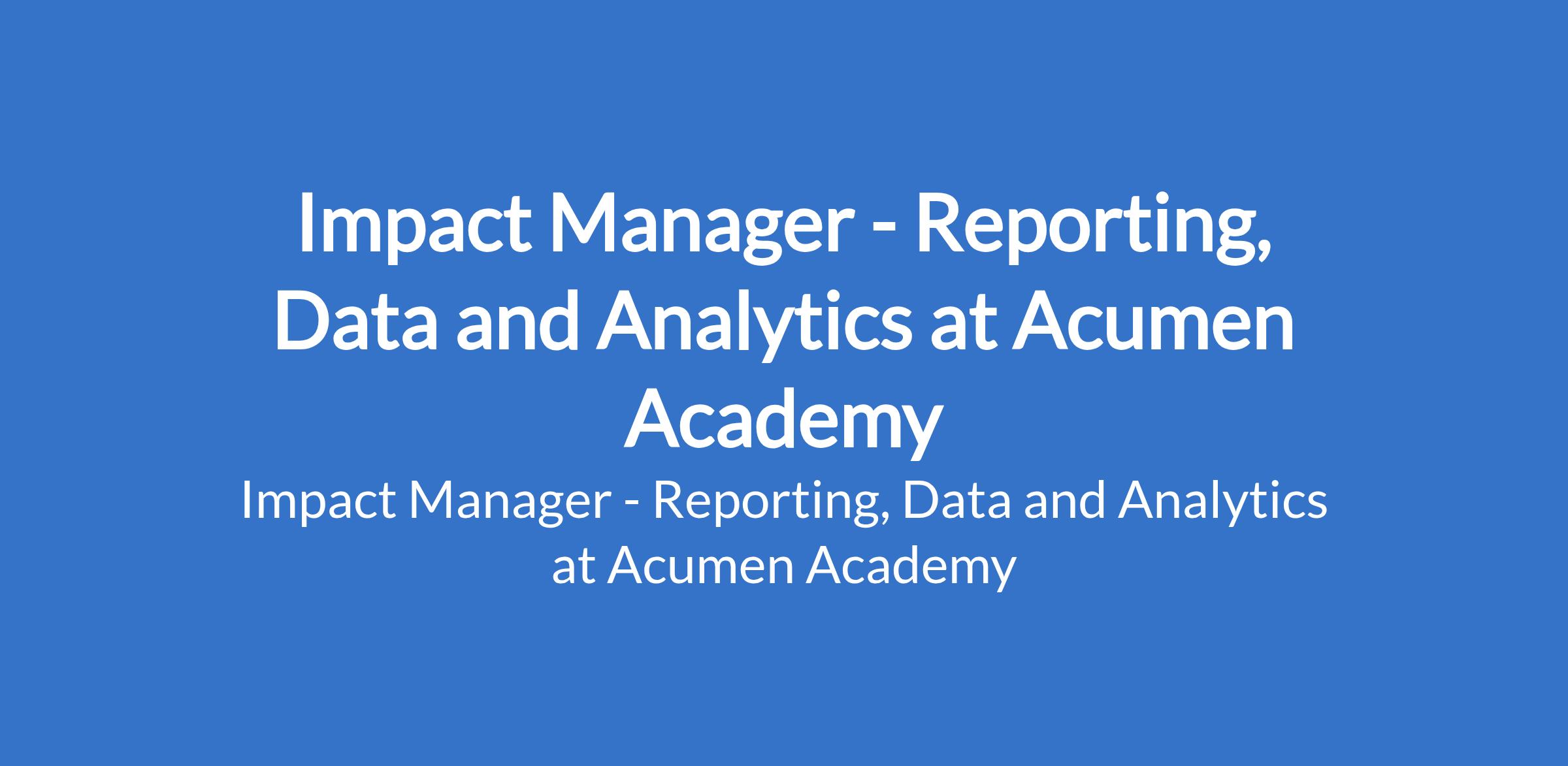 Acumen Academy is recruiting to fill the position of: Impact Manager - Reporting, Data and Analytics. The position is located in Lagos State. Interested candidates should possess relevant qualifications with at least 8 years of professional experience, including at least 3 years of experience in developing and managing data systems, MEL databases, and reporting tools.