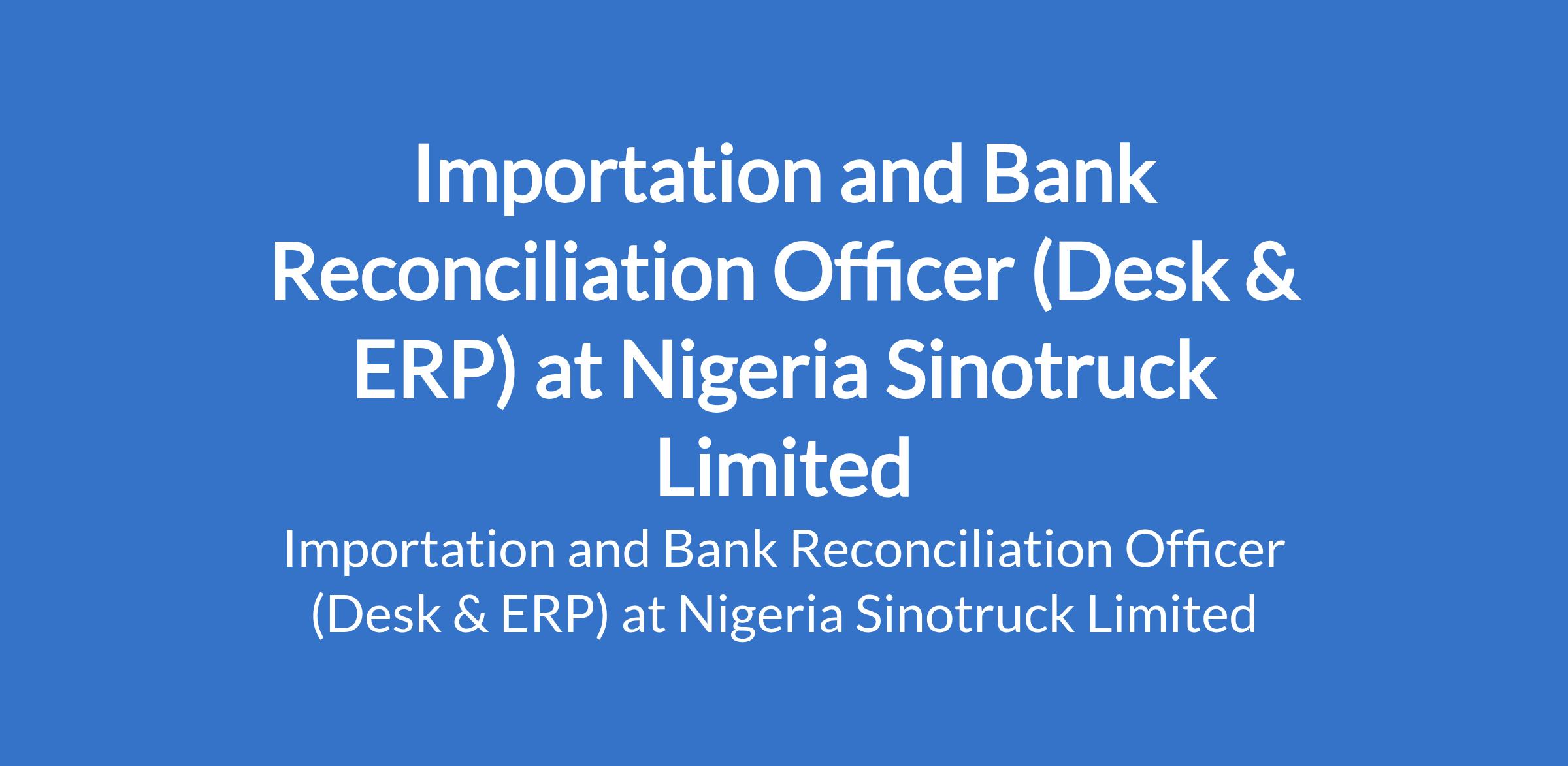 Nigeria Sinotruck Limited is recruiting to fill the position of: Importation and Bank Reconciliation Officer (Desk & ERP). The position is located in Surulere, Lagos State. Interested candidates should possess an HND or BSc Degree with 1 - 2 years experience in accounts department of similar company.