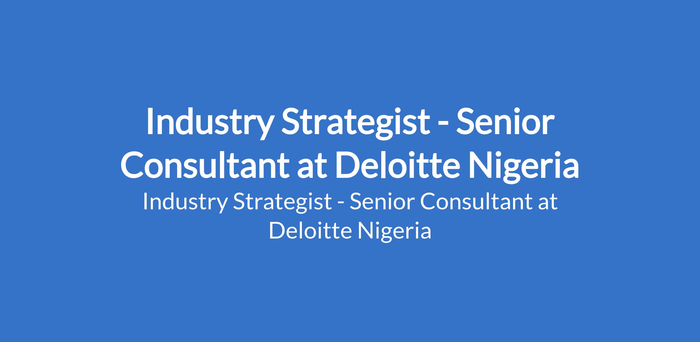 Deloitte Nigeria is recruiting to fill the position of: Industry Strategist - Senior Consultant. The position is located in Ozumba Mbadiwe Ave, Eti-Osa, Lagos State. Interested candidates should possess a Bachelors Degree (B.A., B.Eng., B.Tech., etc.) or Higher National Diploma (HND) in a relevant discipline with at least 4 years experience in a relevant function or area.