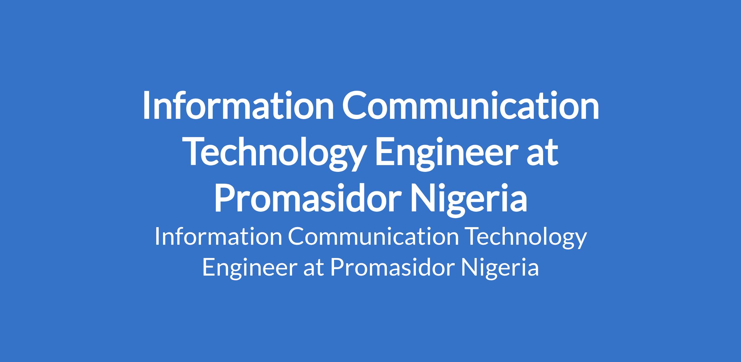 Promasidor Nigeria is recruiting to fill the position of: Information Communication Technology Engineer. The position is located in Lagos State. Interested candidates should possess relevant qualifications with at least 3 years experience in managing and implementing Health program.
