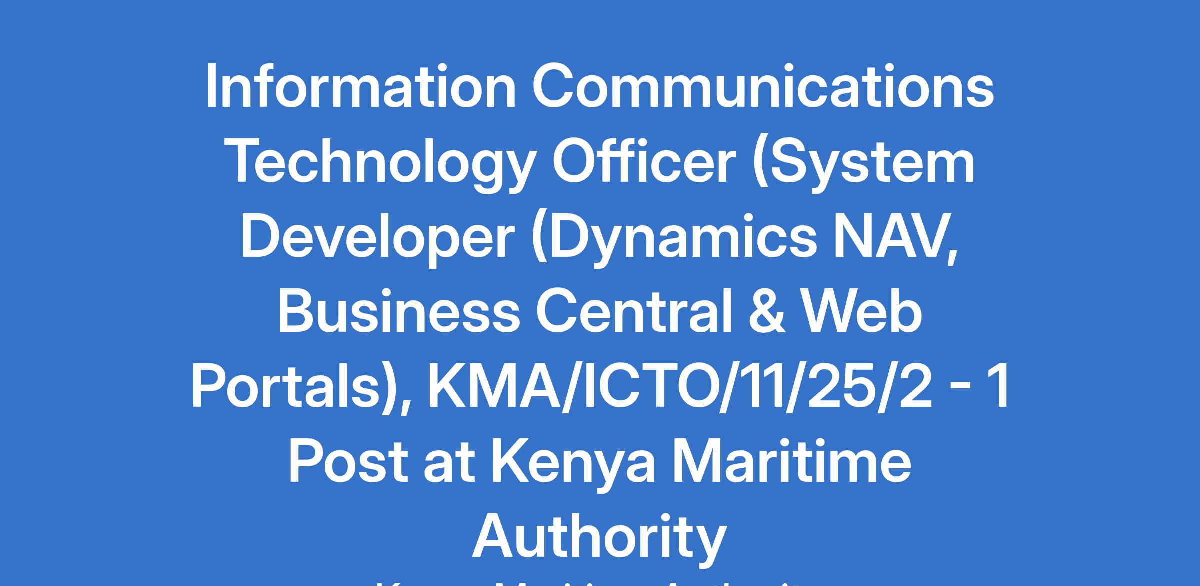 Information Communications Technology Officer (System Developer (Dynamics NAV, Business Central & Web Portals), KMA/ICTO/11/25/2 - 1 Post at Kenya Maritime Authority