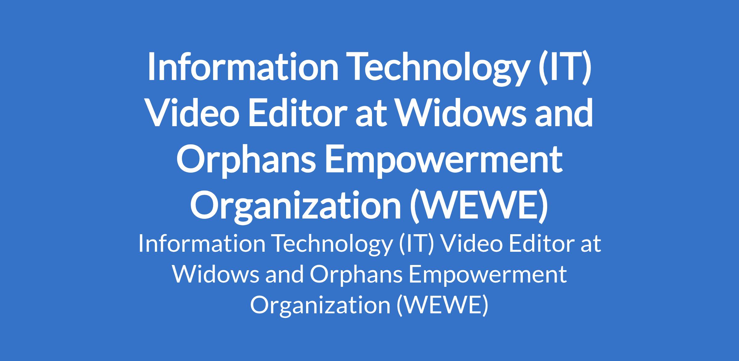 Widows and Orphans Empowerment Organization (WEWE) is recruiting to fill the position of: Information Technology (IT) Video Editor. The position is located in Abuja (FCT). Interested candidates should possess a Bachelors Degree in Mass Communication, Film/Media Studies, Fine Arts, or related fields with 23 years of professional experience in videography, video editing, or media production.