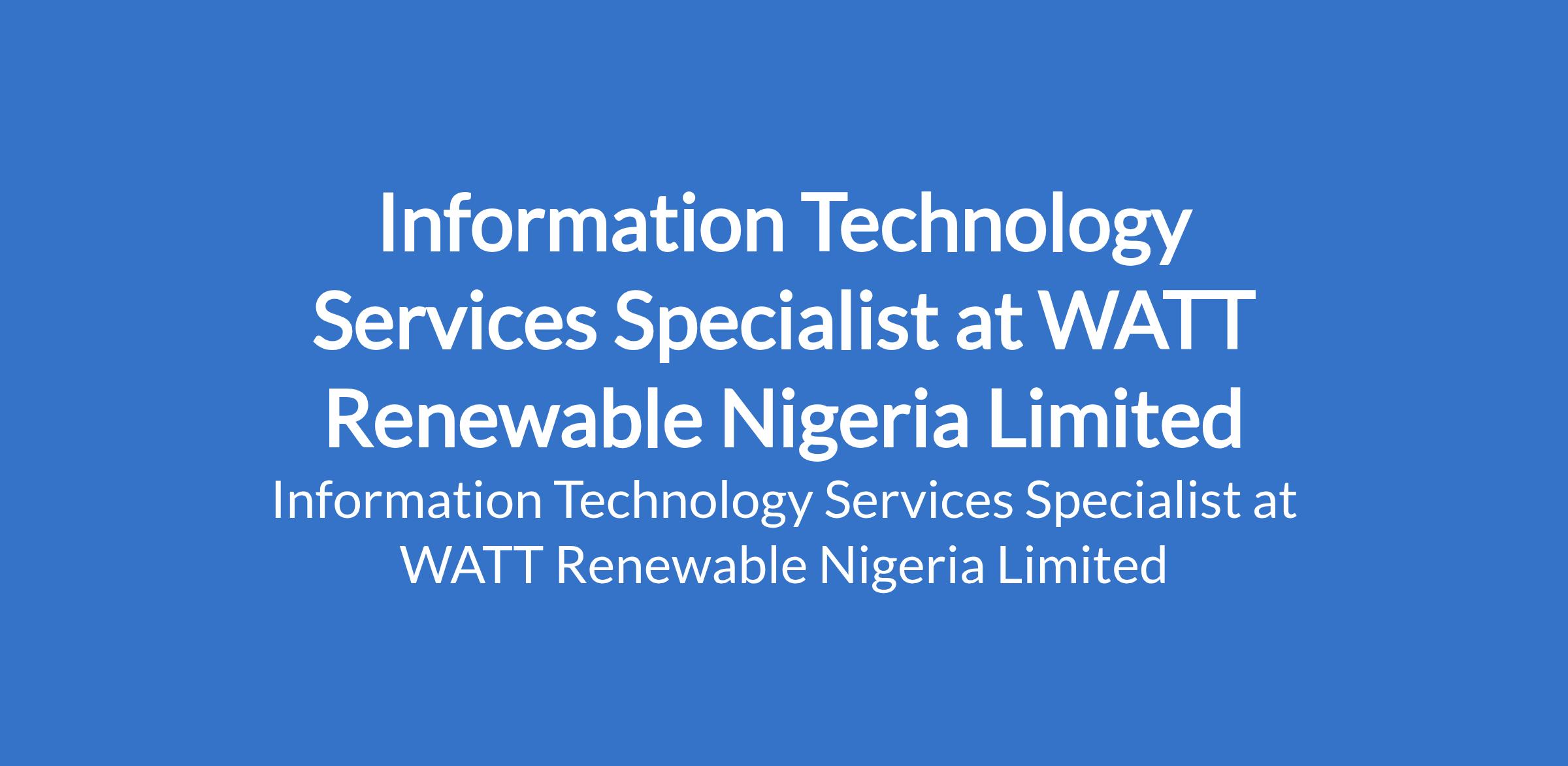 WATT Renewable Nigeria Limited is recruiting to fill the position of: Information Technology Services Specialist. The position is located in Lagos State. Interested candidates should possess a Bachelors Degree in Information Technology, Computer Science, or a related field with 3 6 years of experience in IT support, infrastructure, or IT service delivery.