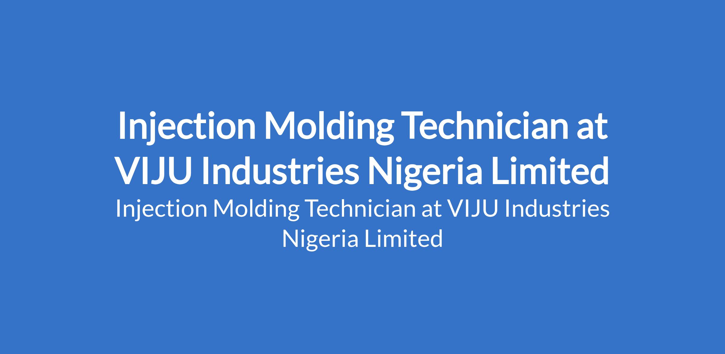 VIJU Industries Nigeria Limited is recruiting to fill the position of: Injection Molding Technician. The position is located in Igbesa, Ogun State. Salary: N100,000 - N300,000 monthly. Interested candidates should possess a Bachelor of Engineering (B.Eng) with 3-10 years experience.