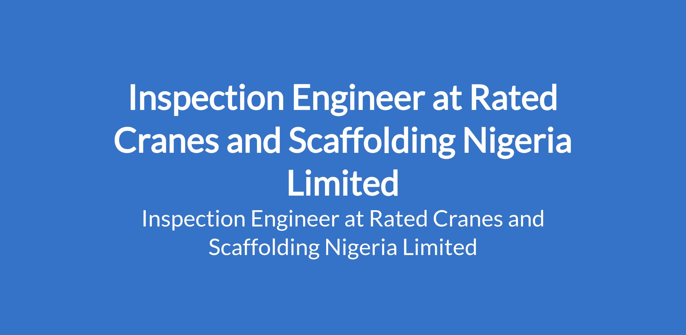 Rated Cranes and Scaffolding Nigeria Limited is recruiting to fill the position of: Inspection Engineer. The position is located in Isolo, Lagos State. Salary: N500,000 - N750,000 per month. Interested candidates should must hold a valid Federal Ministry of Labour Inspection Certificate, LEEA Certification is mandatory with 24 years proven experience inspecting Cranes or Pressure Vessels.