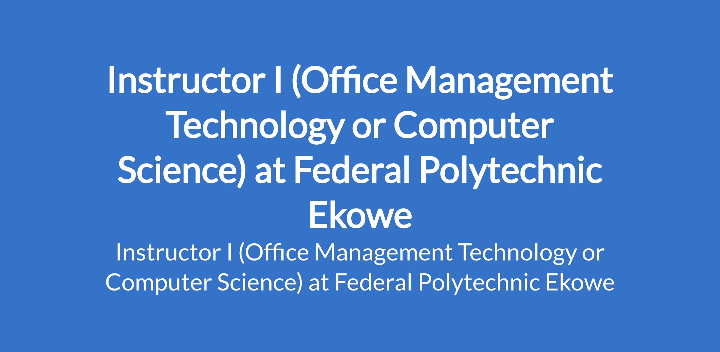 Federal Polytechnic Ekowe invites applications from suitably qualified candidates for the position of: Instructor I (Office Management Technology or Computer Science). The position is located in Bayelsa State. Interested candidates should possess a Bachelor`s Degree (minimum of Second class lower division) or HND at credit level plus NYSC certificate.