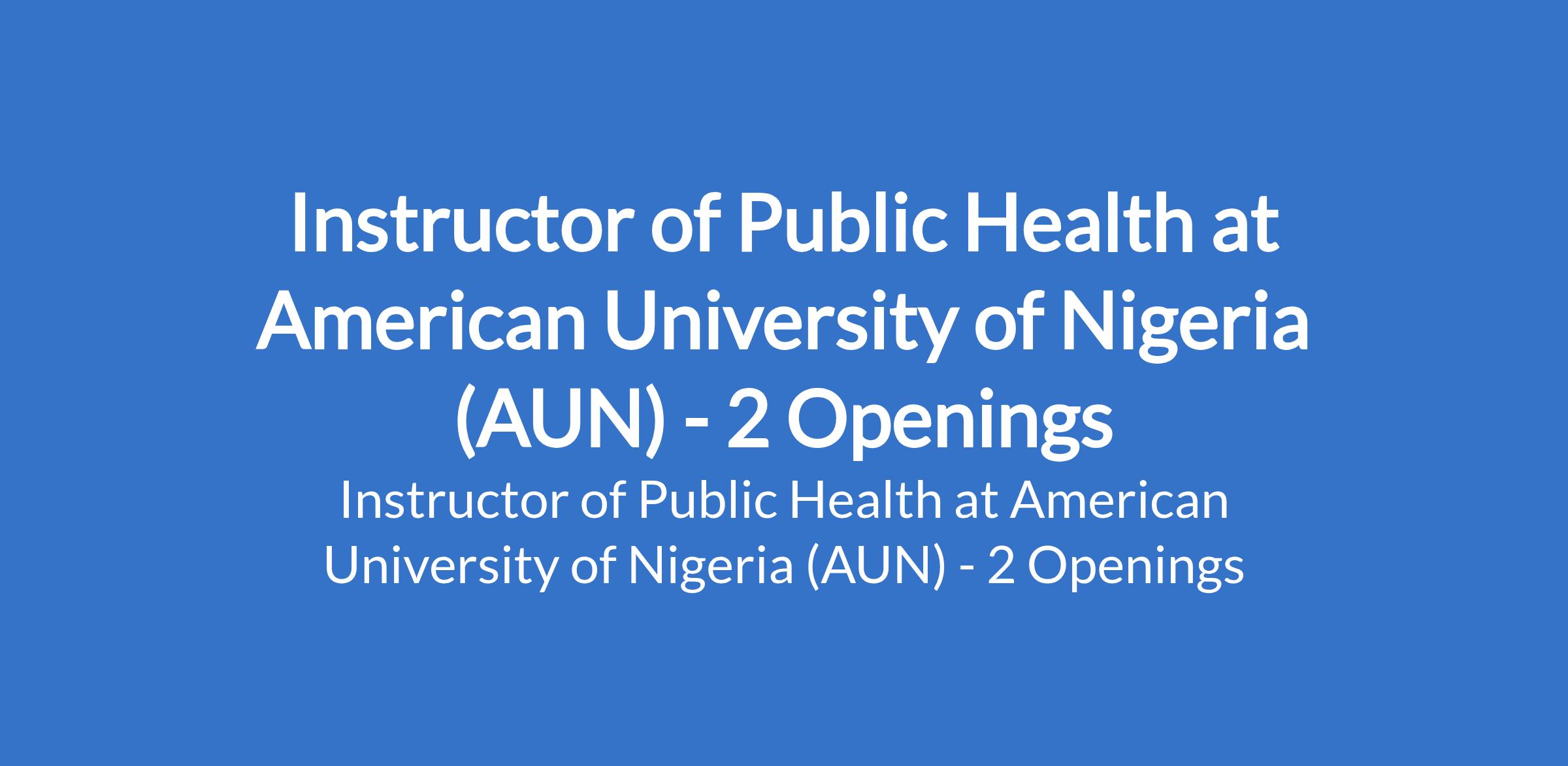 American University of Nigeria (AUN) is recruiting to fill the position of: Instructor of Public Health. The position is located in Yola, Adamawa State. The Instructor of Public Health will be responsible for teaching, research, and community service as may be requested by the Chair/Dean. Interested candidates should possess a Masters Degree in Public Health with 1 year of teaching and/or research experience at the undergraduate level, as well as in Public Health Practice and Community Service.