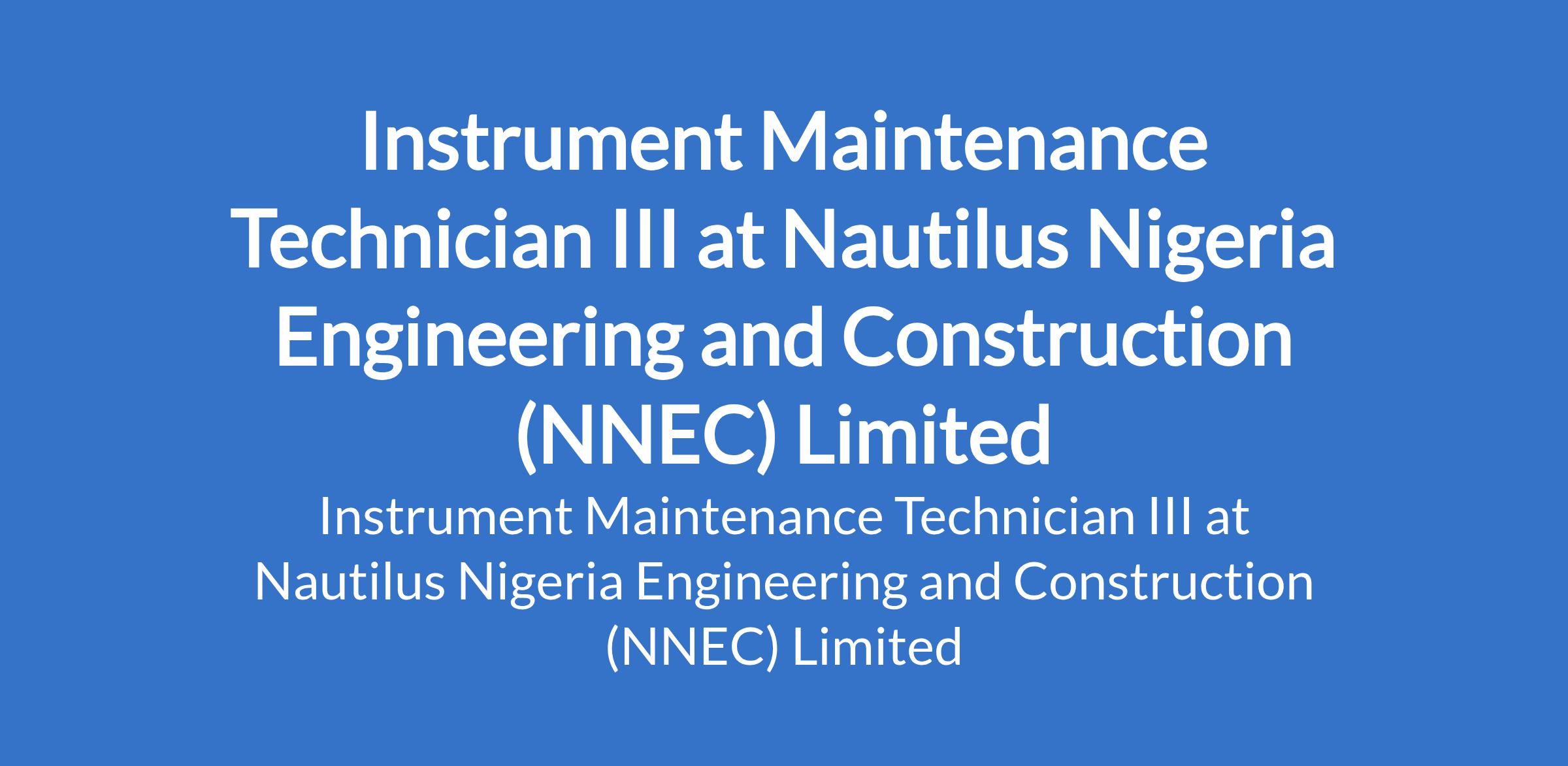 Nautilus Nigeria Engineering and Construction Limited (NNEC) is recruiting to fill the position of: Instrument Maintenance Technician III. The position is located in Akwa Ibom State. Interested candidates should possess an Associates Degree and Technical certifications.