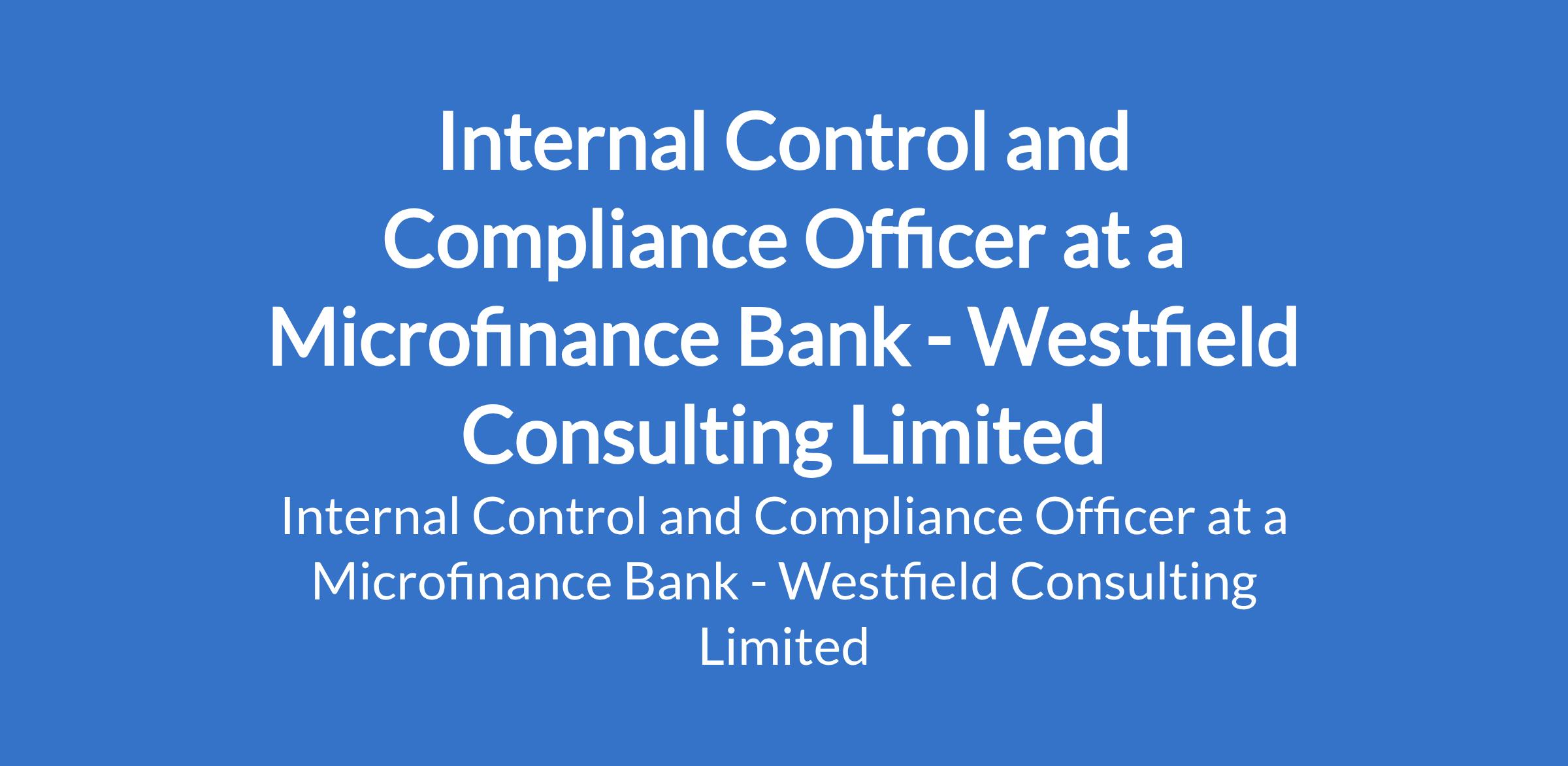 Westfield Consulting Limited - Our client in the Financial Sector (Microfinance Bank) is recruiting to fill the position of: Internal Control and Compliance Officer. The position is located in Ikeja, Lagos State. Salary: N150,000 monthly. Interested candidates should possess a Bachelors Degree in Law, Finance, Business Administration, or a related field with 12 years experience in compliance, internal control, or risk management (preferably in fintech, banking, or financial services).
