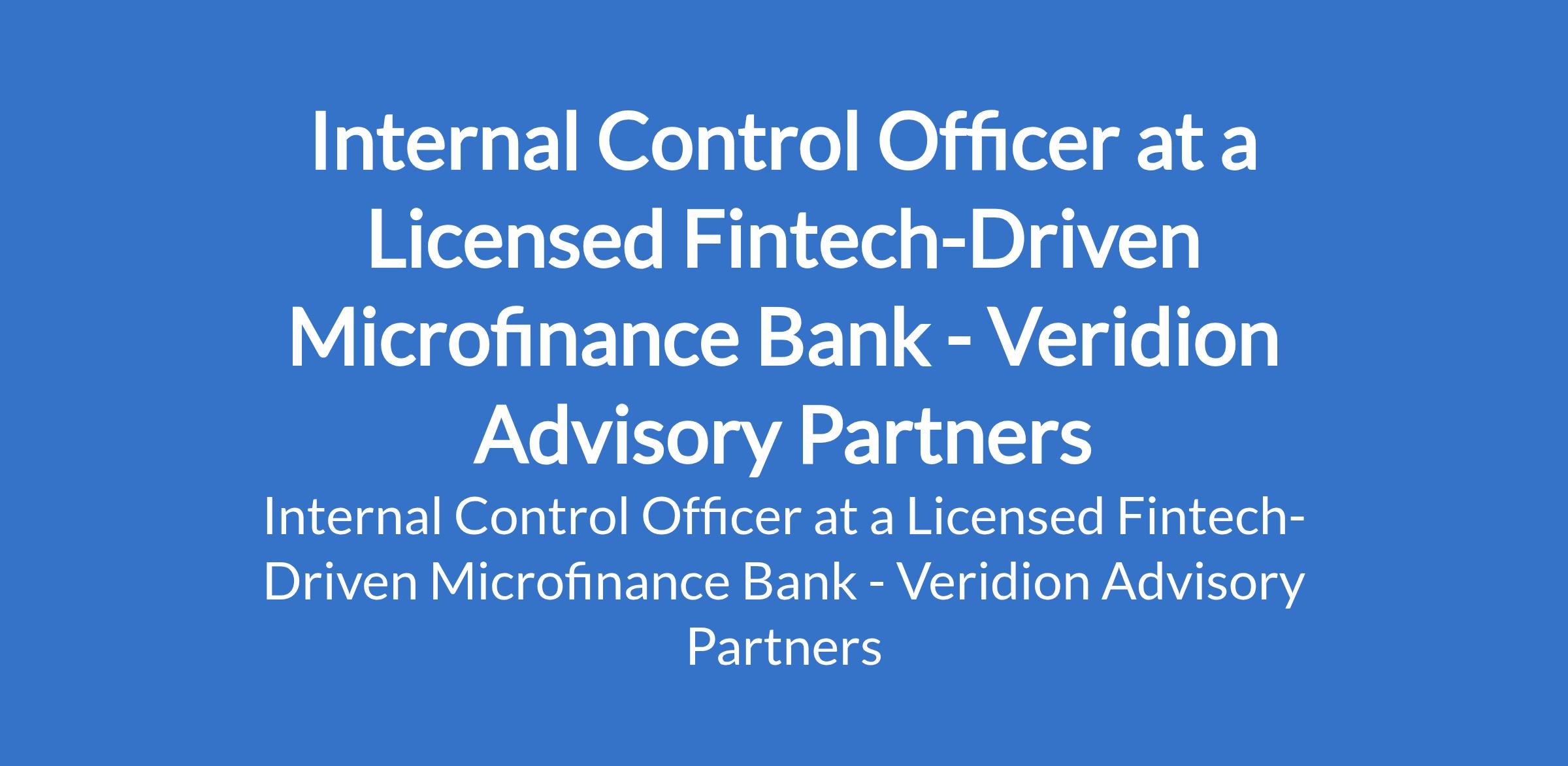 Veridion Advisory Partners Our client, a licensed Fintech-Driven Microfinance Bank is recruiting to fill the position of: Internal Control Officer. The position is located in Lagos State. Bachelors Degree in Accounting, Finance, Economics, or related discipline with a minimum 5 years experience in internal control, audit, or risk management.