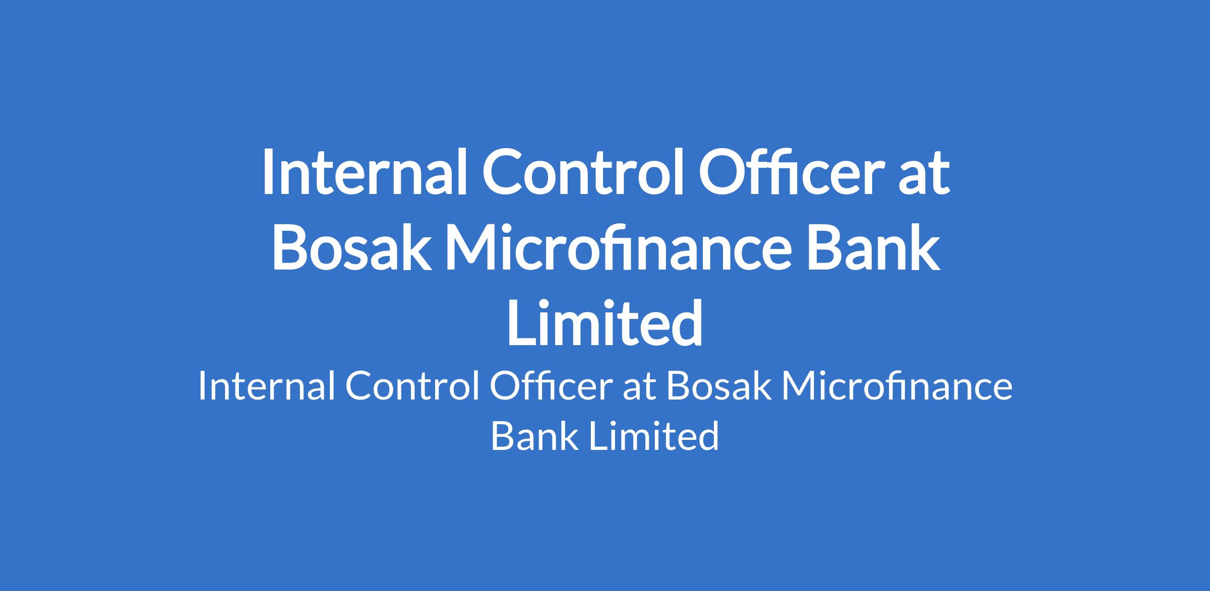 Bosak Microfinance Bank Limited is recruiting to fill the position of: Internal Control Officer. The position is located in Ekiti State. Salary: N100,000 N120,000 monthly. Interested candidates should possess a Bachelor's Degree with 3 - 7 years of work experience.