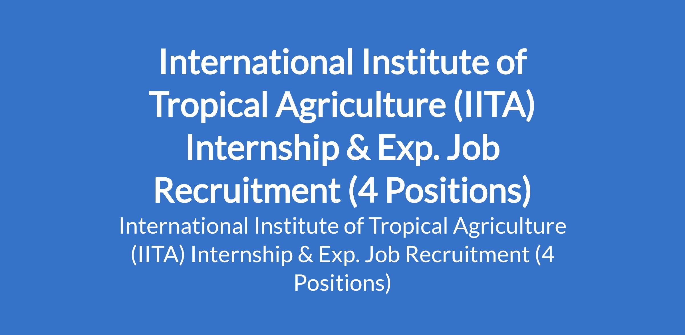 The International Institute of Tropical Agriculture (IITA) is recruiting suitable candidates to fill the following positions in Kano and Oyo States: Postdoctoral Fellow - Cowpea Plant Breeding and Genetics; Laboratory Manager (Talent Pool); Talent Acquisition Intern; and Consultant.