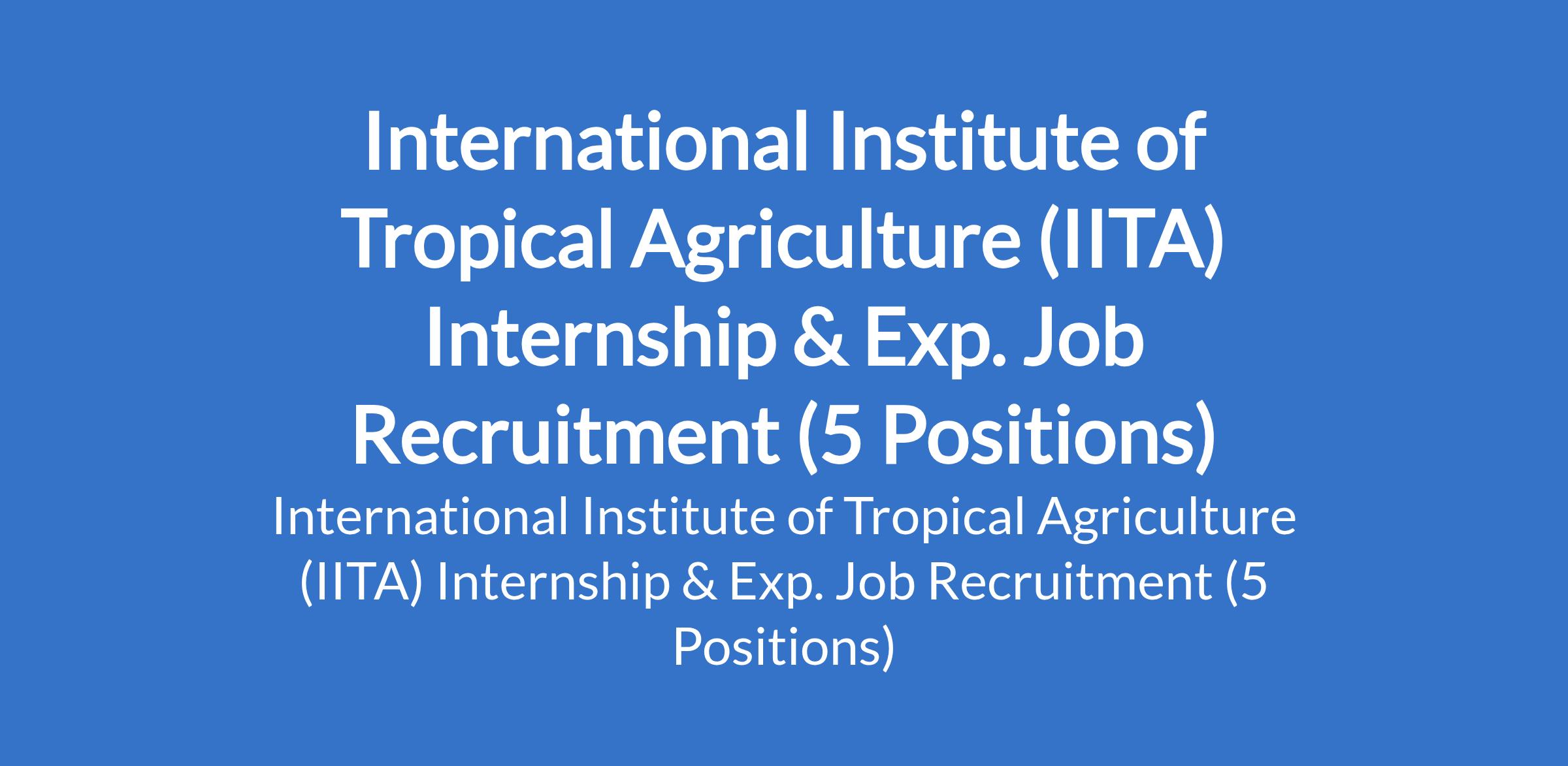The International Institute of Tropical Agriculture (IITA) is recruiting suitable candidates to fill the following positions in Oyo State: Talent Acquisition Intern; People and Culture Officer, Services, Middle School English Teacher; Consultant, Project Accountant; and International Consultant.