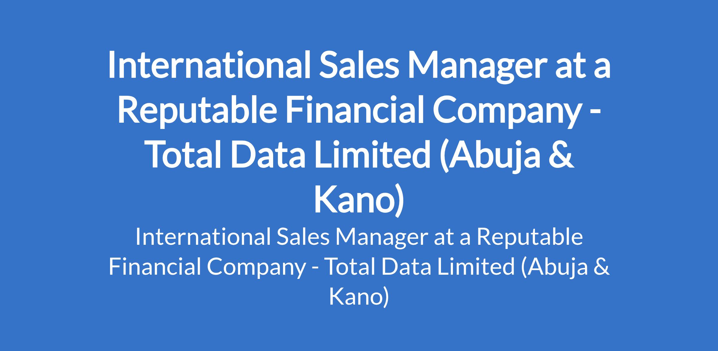 Total Data Limited - Our client, a reputable company in the Financial Sector is recruiting to fill the position of: International Sales Manager. The position is located in Abuja and Kano State. Salary: USD 150 monthly. Interested candidates should possess relevant qualifications.