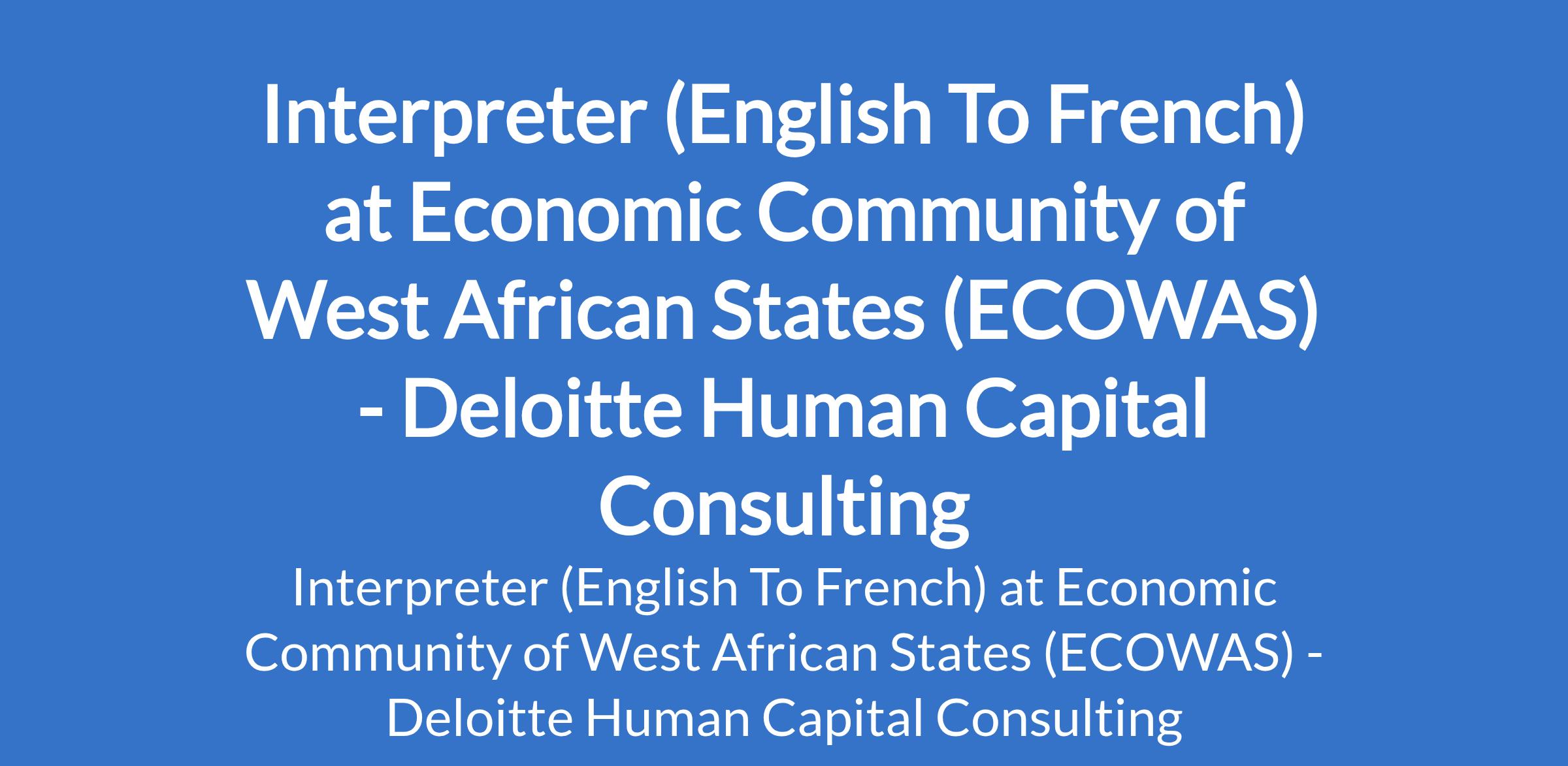 Deloitte Human Capital Consulting - Our client, Economic Community of West African States (ECOWAS) is recruiting to fill the position of: Interpreter (English To French). The position is located in Abuja. Interested candidates should possess a Master's Degree plus a Diploma or certificate in conference interpreting from a recognized school or a University Degree in conference interpreting from a recognized school with 10 years of experience in Interpretation (four of which should have been as a staff Interpreter).