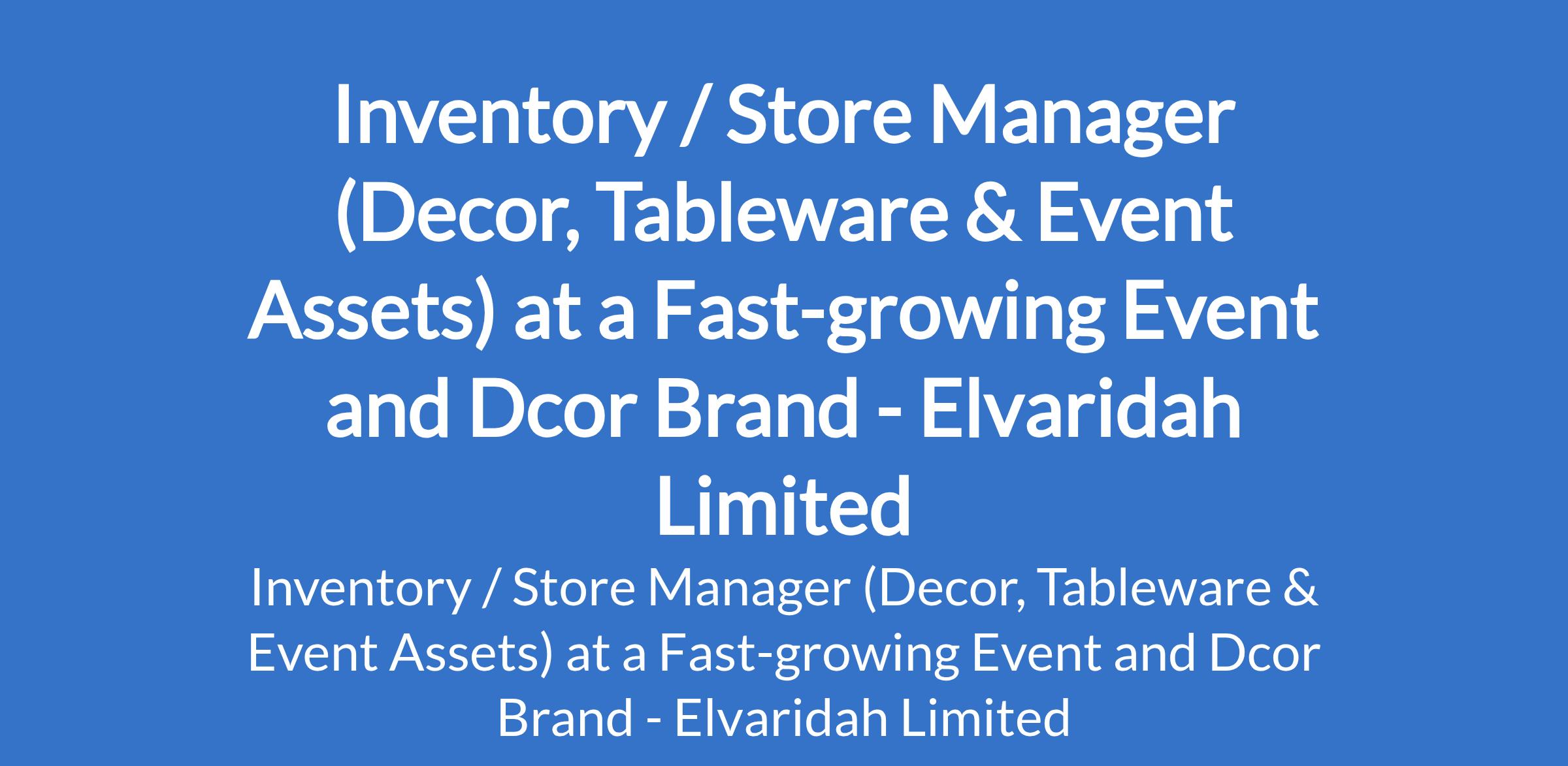 Elvaridah Limited - Our client, a fast-growing event and dcor brand is recruiting to fill the position of: Inventory / Store Manager (Decor, Tableware & Event Assets). The position is located in Lekki, Lagos State. Salary: N250,000 monthly. Interested candidates should possess an OND / HND / BSc Degree in Logistics, Supply Chain Management, Accounting, Business Administration, or related disciplines with proven experience in inventory, store, warehouse, or asset management (event, hospitality, dcor, or related industry preferred).