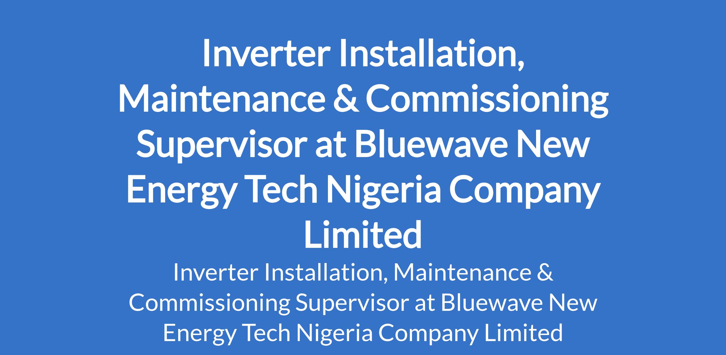 Blue Wave New Energy Technology Nigeria Company Limited is recruiting to fill the position of: Inverter Installation, Maintenance & Commissioning Supervisor. The position is located in Lagos State. Salary: N300,000 - N500,000 monthly. Interested candidates should possess an HND / B.Sc Degree with 2-4 years experience.