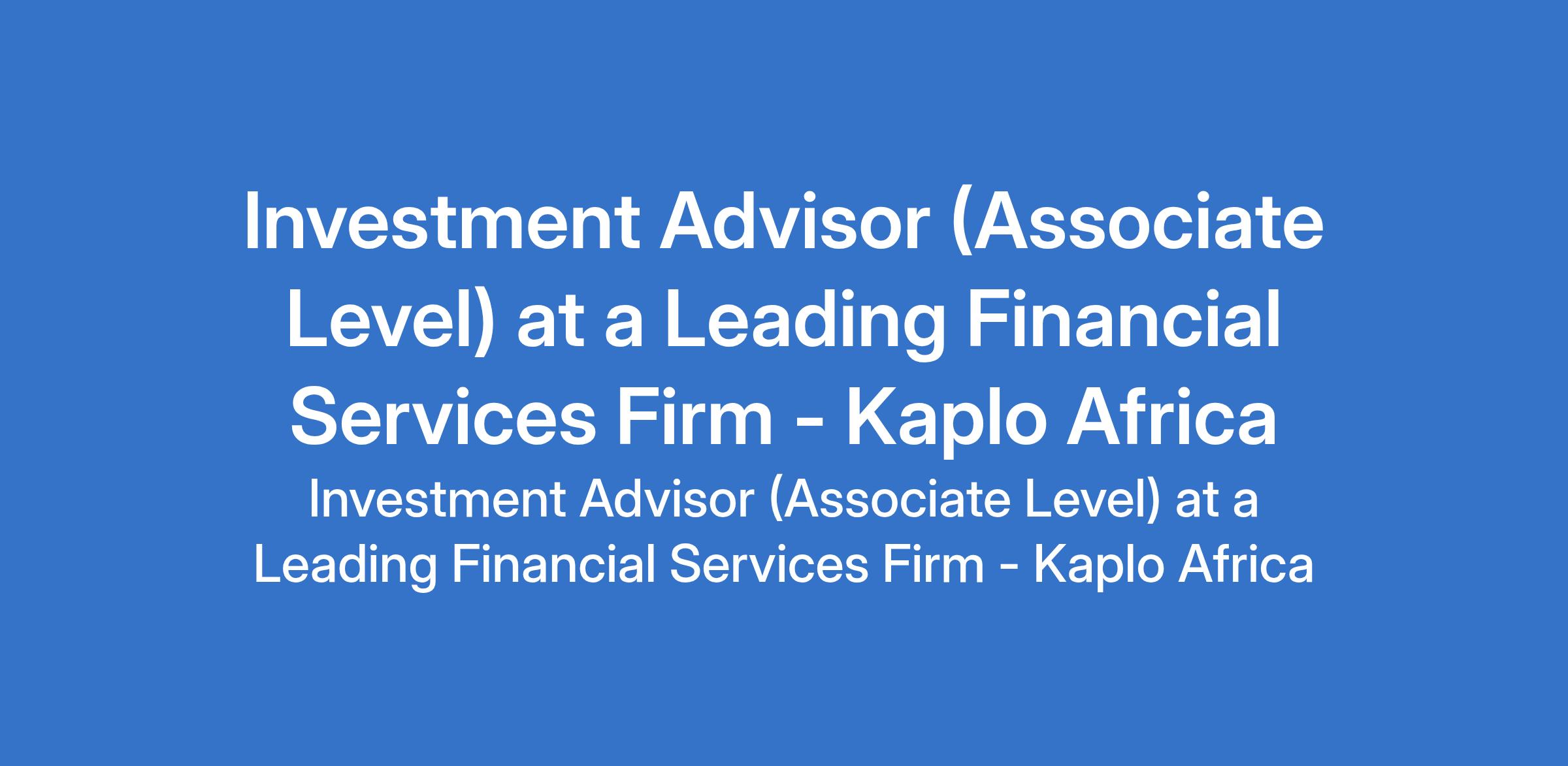Kaplo Africa - Our client, a leading financial services firm is recruiting to fill the position of: Investment Advisor (Associate Level). The position is located in Ikoyi, Lagos State. Interested candidates should possess relevant qualifications with 610 years experience in investment advisory, wealth management, or asset management.