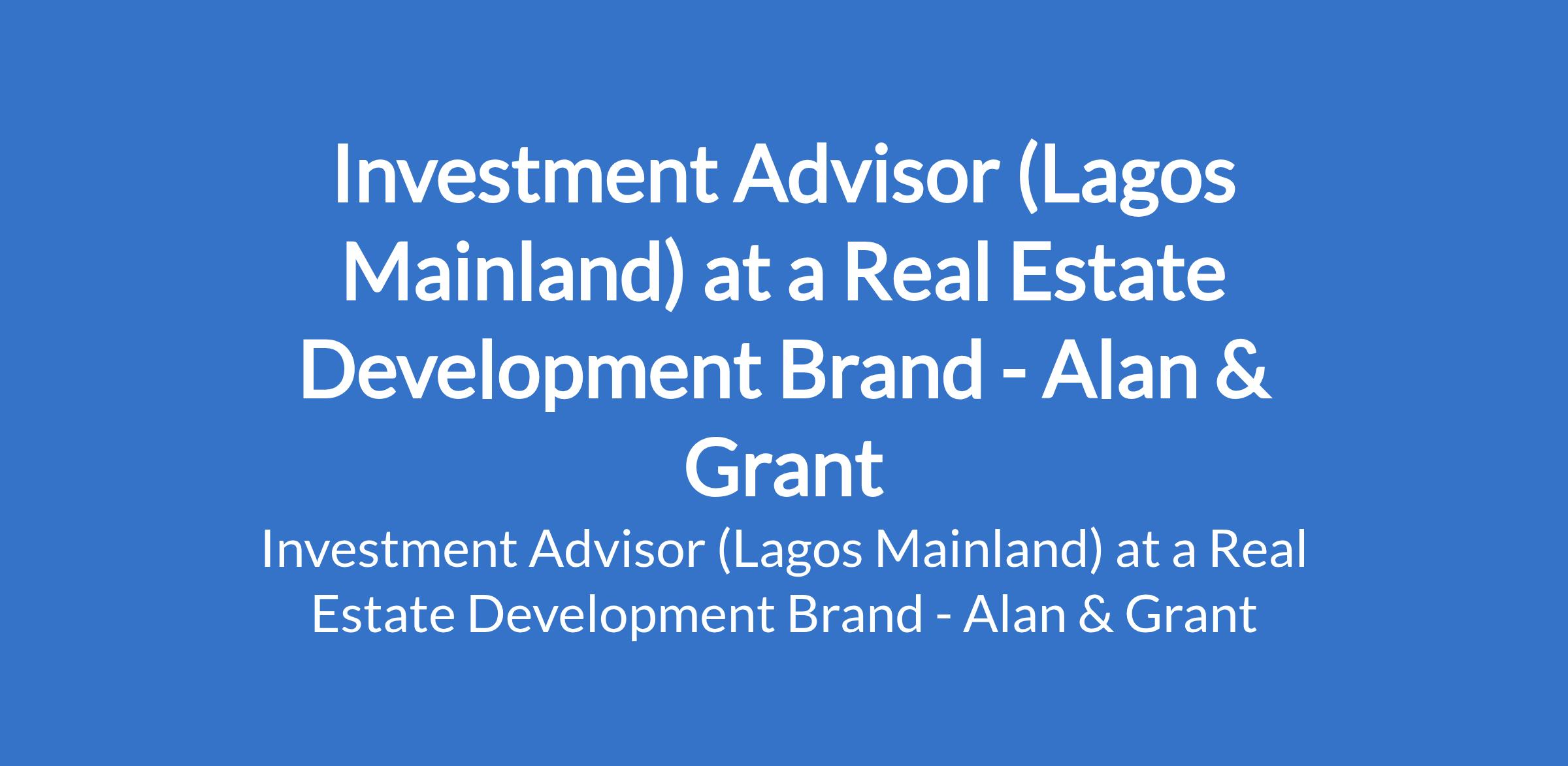 Investment Advisor (Lagos Mainland) at a Real Estate Development Brand - Alan & Grant