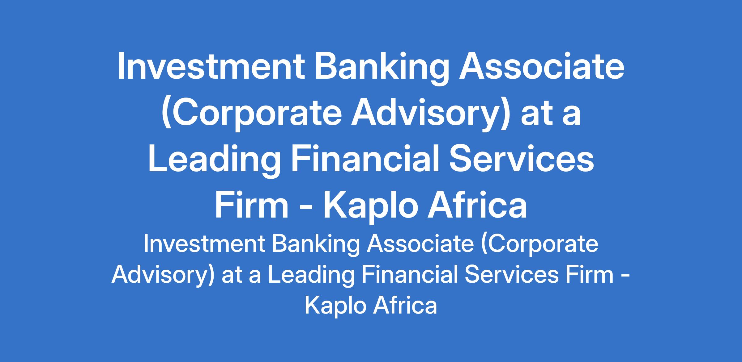 Kaplo Africa - Our client, a leading financial services firm is recruiting to fill the position of: Investment Banking Associate (Corporate Advisory). The position is located in Ikoyi, Lagos State. Salary: N850,000 monthly. Interested candidates should possess relevant qualifications with 610 years experience in investment banking or corporate finance.