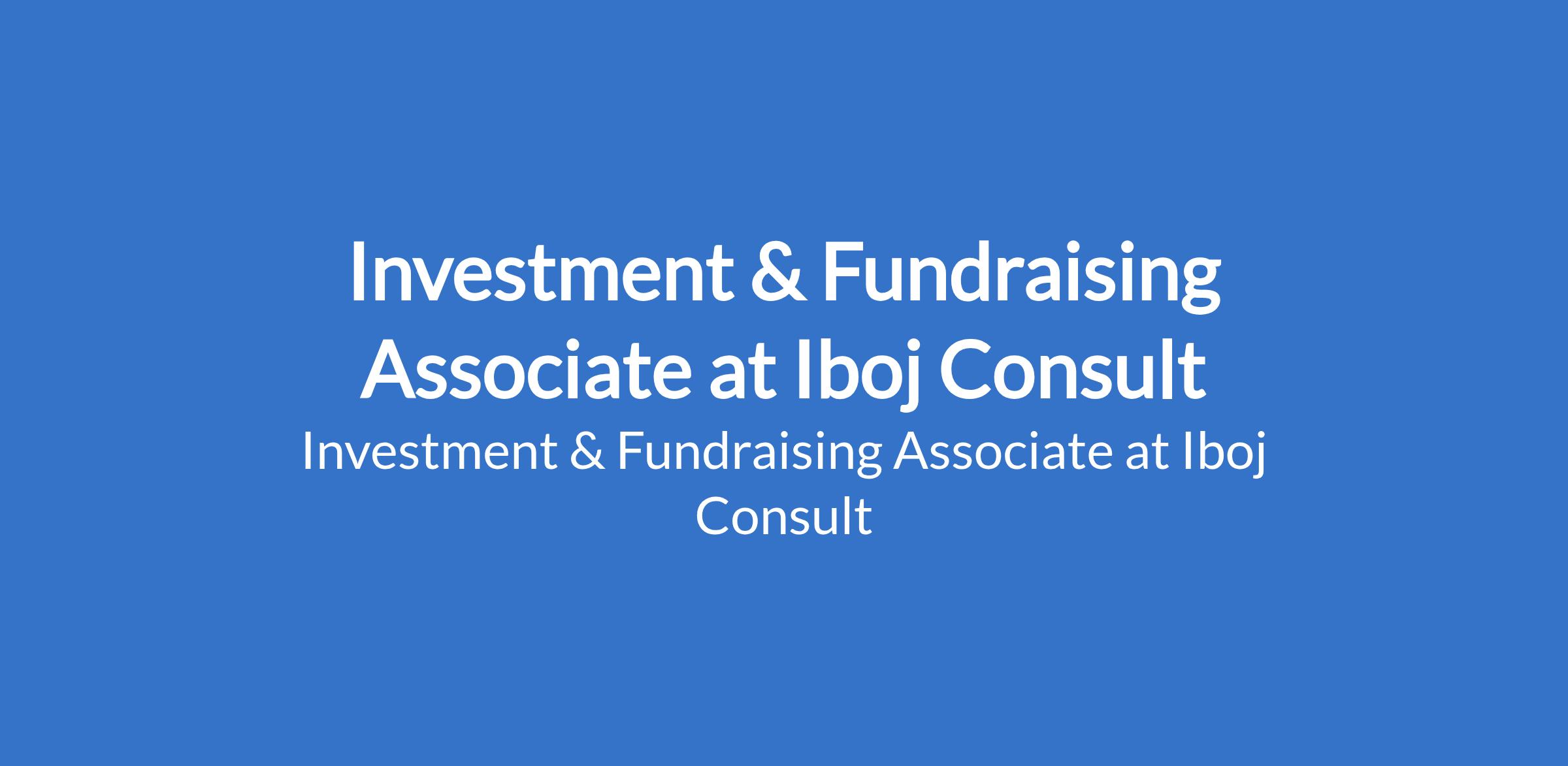 Iboj Consult is recruiting to fill the position of: Investment & Fundraising Associate. The position is located in Lagos State. Interested candidates should possess relevant qualifications with 3 4 years experience in an investment firm, venture capital, private equity, or related environment.