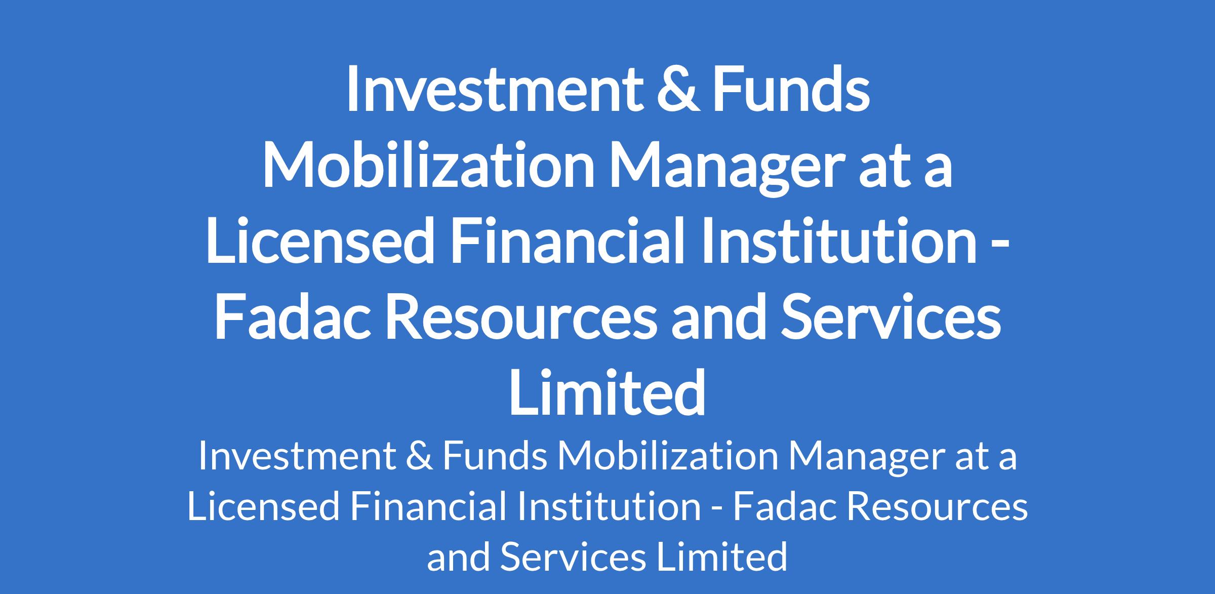 Fadac Resources and Services Limited - Our client, a licensed financial institution is recruiting to fill the position of: Investment & Funds Mobilization Manager. The position is located in Ikoyi, Lagos State. Interested candidates should possess a Bachelors Degree in any field, a Masters Degree and/or a professional qualification will be an added advantage with 3 - 6 years working experience in the financial services industry, focusing on a market-facing financial treasury role.